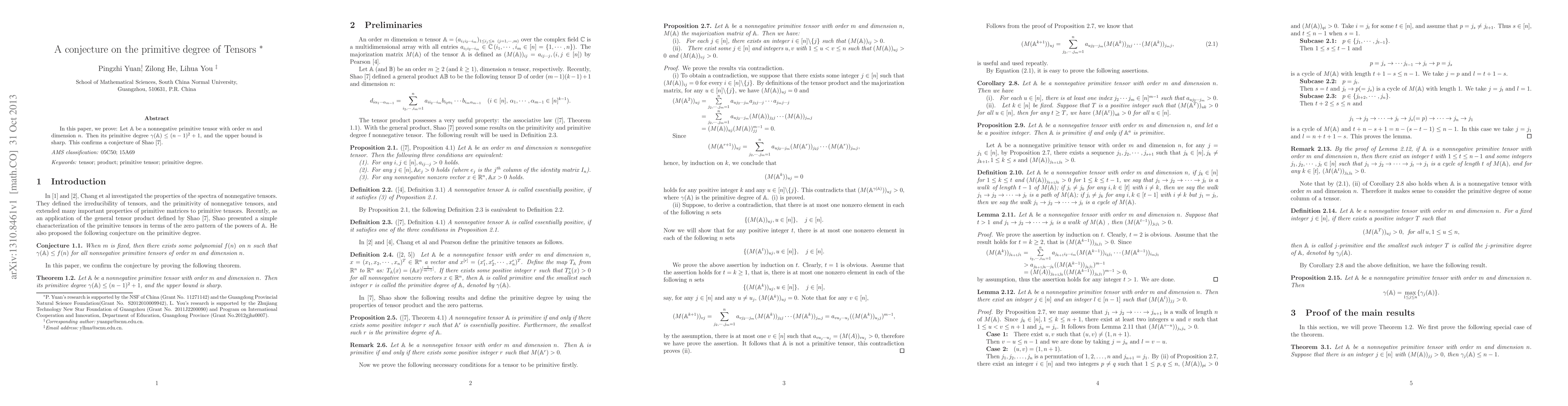 This paper proves that for any nonnegative primitive tensor A of order m and dimension n, its primitive degree R(A) is at most (n-1)^2 + 1, confirming the conjecture of Shao. The upper bound is shown to be sharp.