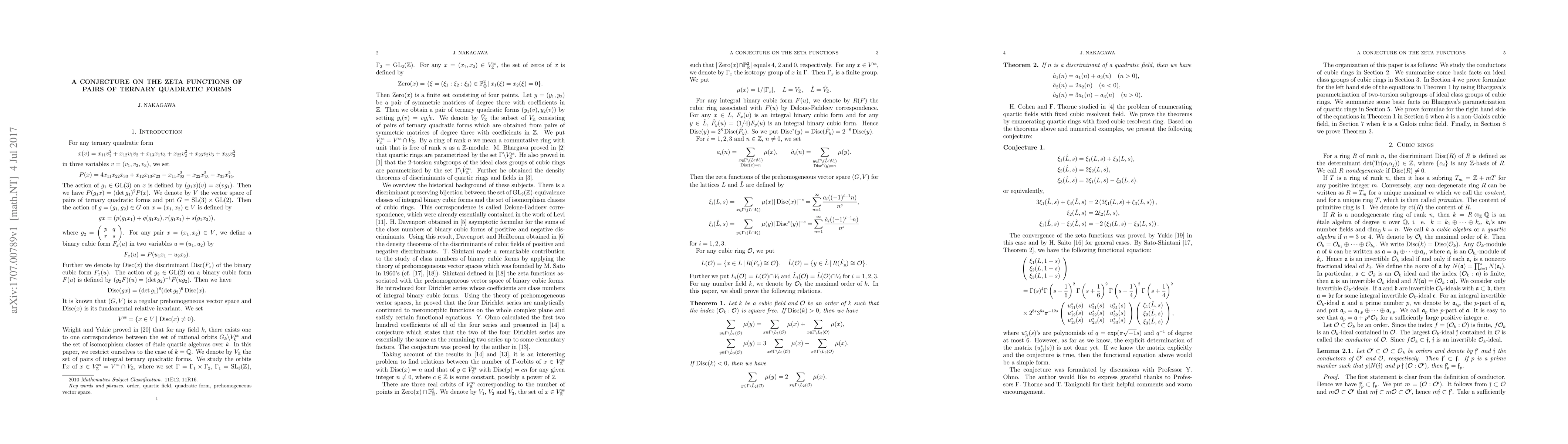 This paper proposes a conjecture regarding the zeta functions of pairs of ternary quadratic forms, suggesting simple relations among six associated zeta functions. It proves that the coefficients of these relations match on fundamental discriminants.