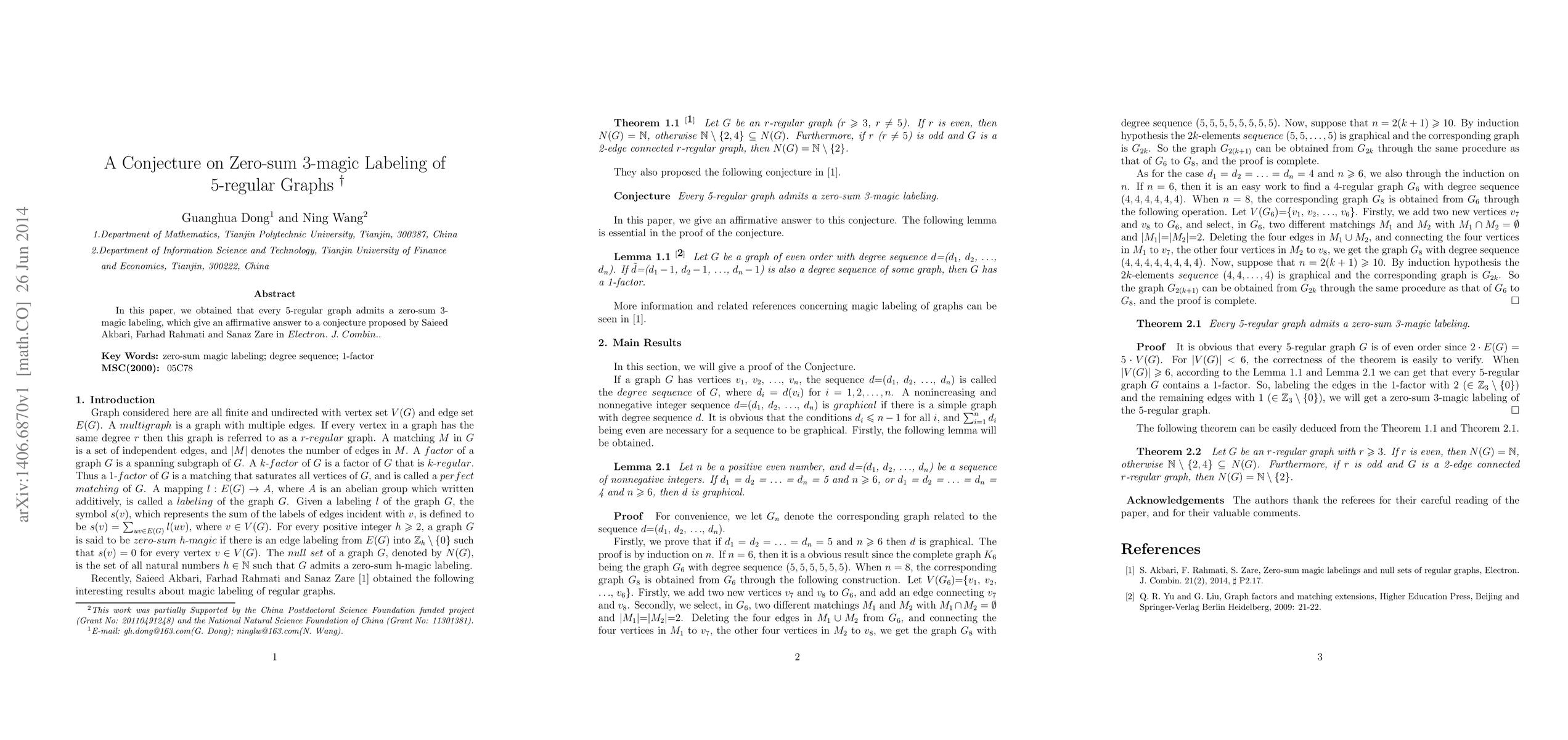 The paper presents a proof for the existence of zero-sum 3-magic labelings in 5-regular graphs, confirming a conjecture and advancing the theory of graph labelings.