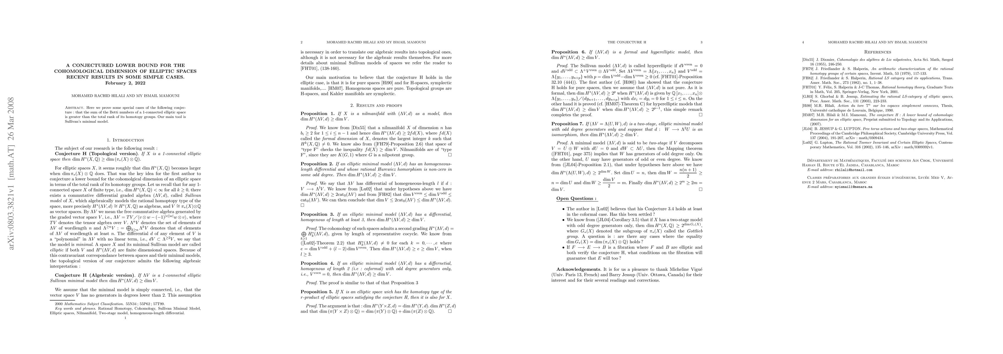 Here we prove some special cases of the following conjecture: that the sum of the Betti numbers of a 1-connected elliptic space is greater than the total rank of its homotopy groups. Our main tool is Sullivan's minimal model.