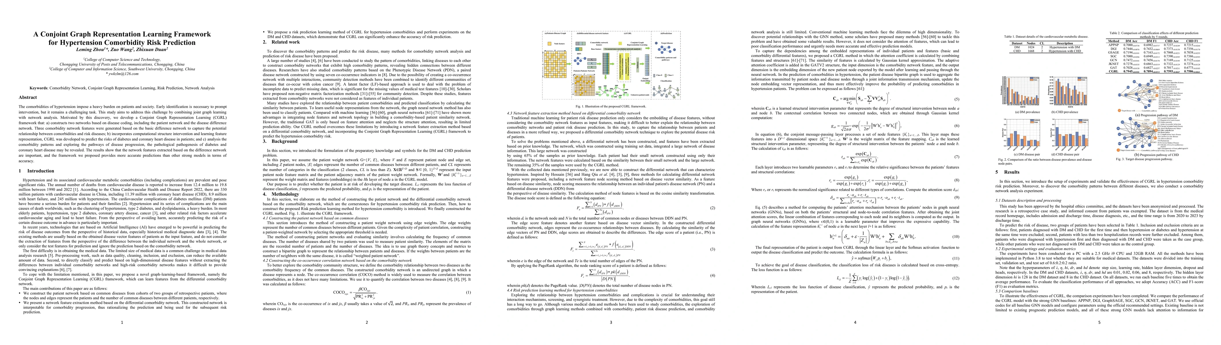 The comorbidities of hypertension impose a heavy burden on patients and society. Early identification is necessary to prompt intervention, but it remains a challenging task. This study aims to address this challenge by combining joint graph learning with network analysis. Motivated by this discovery, we develop a Conjoint Graph Representation Learning (CGRL) framework that: a) constructs two networks based on disease coding, including the patient network and the disease difference network. Three comorbidity network features were generated based on the basic difference network to capture the potential relationship between comorbidities and risk diseases; b) incorporates computational structure intervention and learning feature representation, CGRL was developed to predict the risks of diabetes and coronary heart disease in patients; and c) analysis the comorbidity patterns and exploring the pathways of disease progression, the pathological pathogenesis of diabetes and coronary heart disease may be revealed. The results show that the network features extracted based on the difference network are important, and the framework we proposed provides more accurate predictions than other strong models in terms of accuracy.