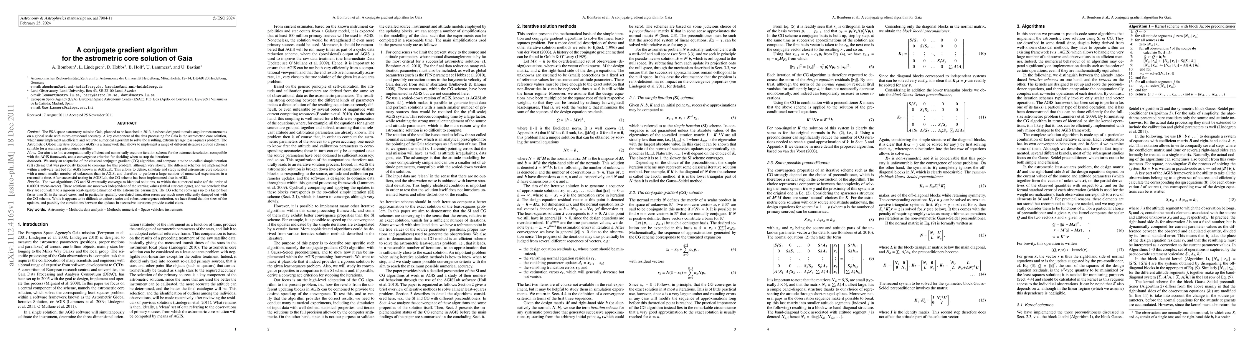 This paper investigates an adaptation of the conjugate gradient (CG) algorithm for the astrometric core solution of the Gaia mission, comparing it to the simple iteration (SI) scheme. The CG algorithm converges up to four times faster than SI, efficiently damping out spatially correlated truncation errors, while both schemes provide equivalent solutions within numerical noise.
