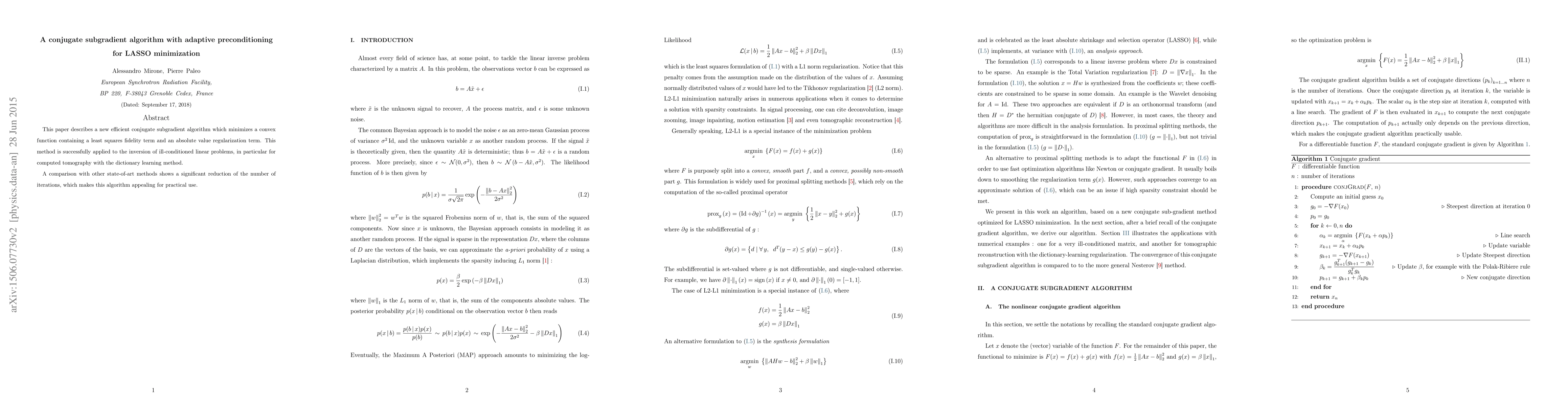 This paper describes a new efficient conjugate subgradient algorithm which minimizes a convex function containing a least squares fidelity term and an absolute value regularization term. This method is successfully applied to the inversion of ill-conditioned linear problems, in particular for computed tomography with the dictionary learning method. A comparison with other state-of-art methods shows a significant reduction of the number of iterations, which makes this algorithm appealing for practical use.