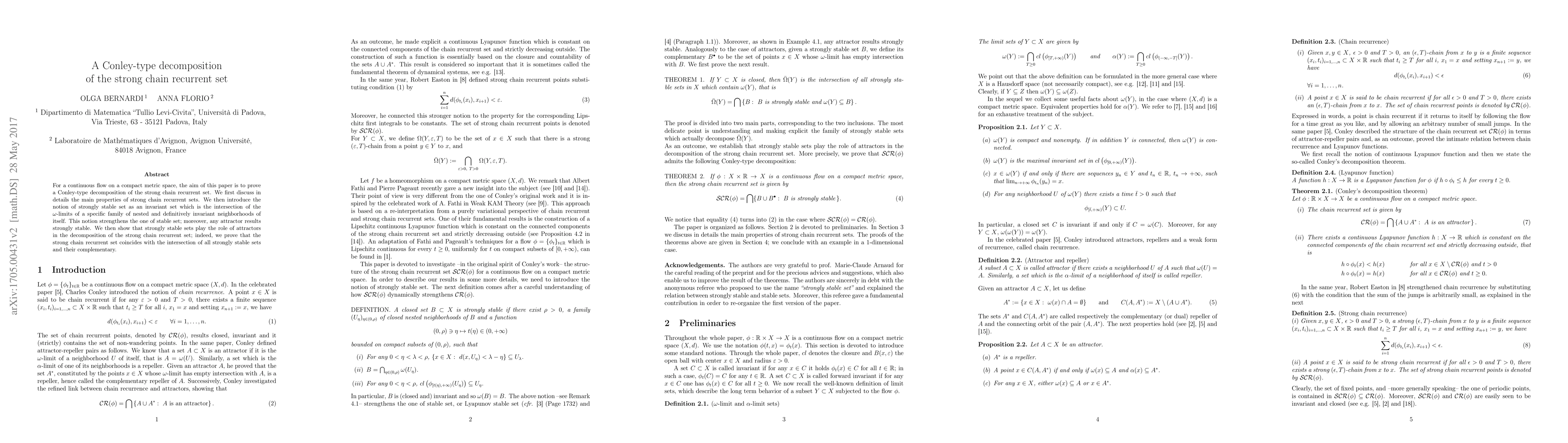 This paper proves a Conley-type decomposition of the strong chain recurrent set for continuous flows on compact metric spaces, showing that it coincides with the intersection of strongly stable sets and their complementaries, which act as attractors in this context.