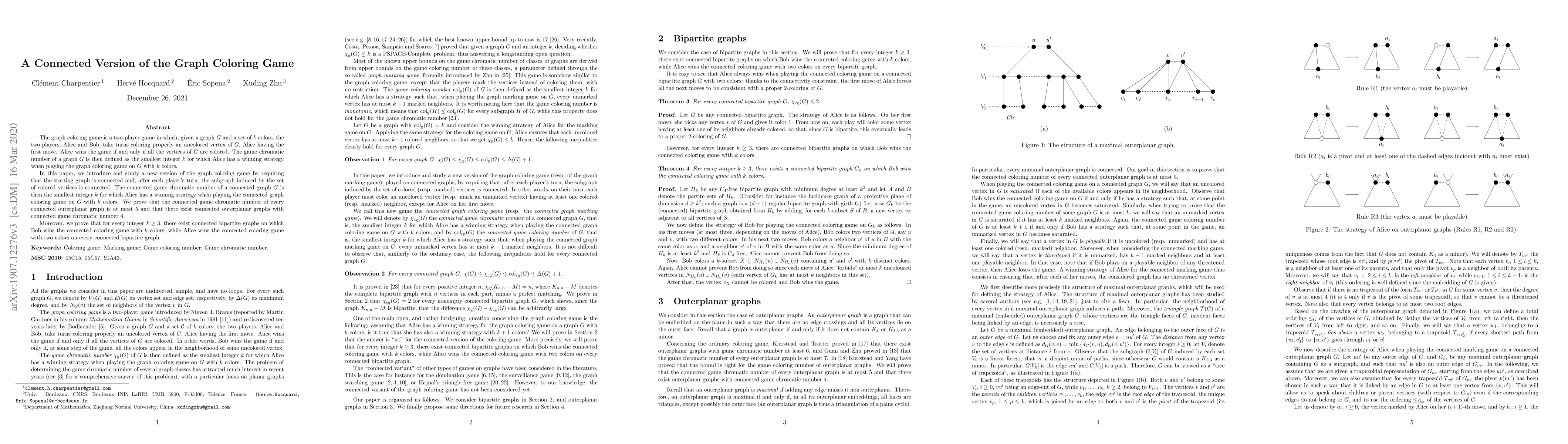 This paper explores a connected version of the graph coloring game where players must ensure that the subgraph of colored vertices remains connected after each turn. It establishes that the connected game chromatic number for outerplanar graphs is at most 5, with some reaching 4, and demonstrates that for k $\ge$ 3, Bob can win with k colors on certain bipartite graphs, while Alice wins with just two colors on any bipartite graph.
