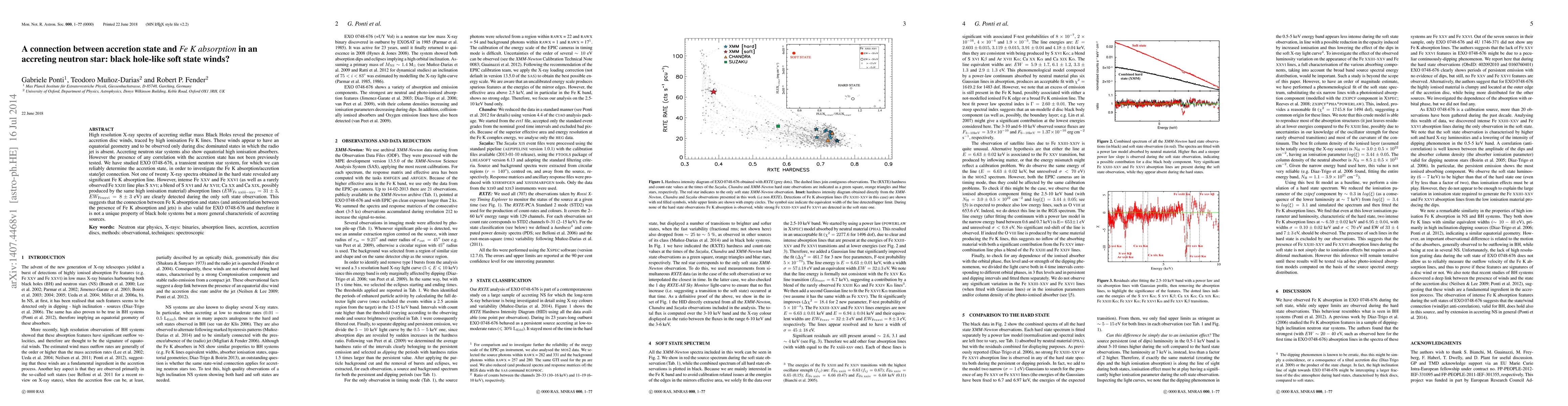 High resolution X-ray spectra of accreting stellar mass Black Holes reveal the presence of accretion disc winds, traced by high ionisation Fe K lines. These winds appear to have an equatorial geometry and to be observed only during disc dominated states in which the radio jet is absent. Accreting neutron star systems also show equatorial high ionisation absorbers. However, the presence of any correlation with the accretion state has not been previously tested. We have studied EXO 0748-676, a transient neutron star system, for which we can reliably determine the accretion state, in order to investigate the Fe K absorption/accretion state/jet connection. Not one of twenty X-ray spectra obtained in the hard state revealed any significant Fe K absorption line. However, intense Fe ${\scriptsize{\rm XXV}}$ and Fe ${\scriptsize{\rm XXVI}}$ (as well as a rarely observed Fe ${\scriptsize{\rm XXIII}}$ line plus S ${\scriptsize{\rm XVI}}$; a blend of S ${\scriptsize{\rm XVI}}$ and Ar ${\scriptsize{\rm XVII}}$; Ca ${\scriptsize{\rm XX}}$ and Ca ${\scriptsize{\rm XIX}}$, possibly produced by the same high ionisation material) absorption lines ($EW_{\rm Fe~{XXIII-XXV}}=31\pm3$ eV, $EW_{\rm Fe~XXVI}=8\pm3$ eV) are clearly detected during the only soft state observation. This suggests that the connection between Fe K absorption and states (and anticorrelation between the presence of Fe K absorption and jets) is also valid for EXO 0748-676 and therefore it is not a unique property of black hole systems but a more general characteristic of accreting sources.