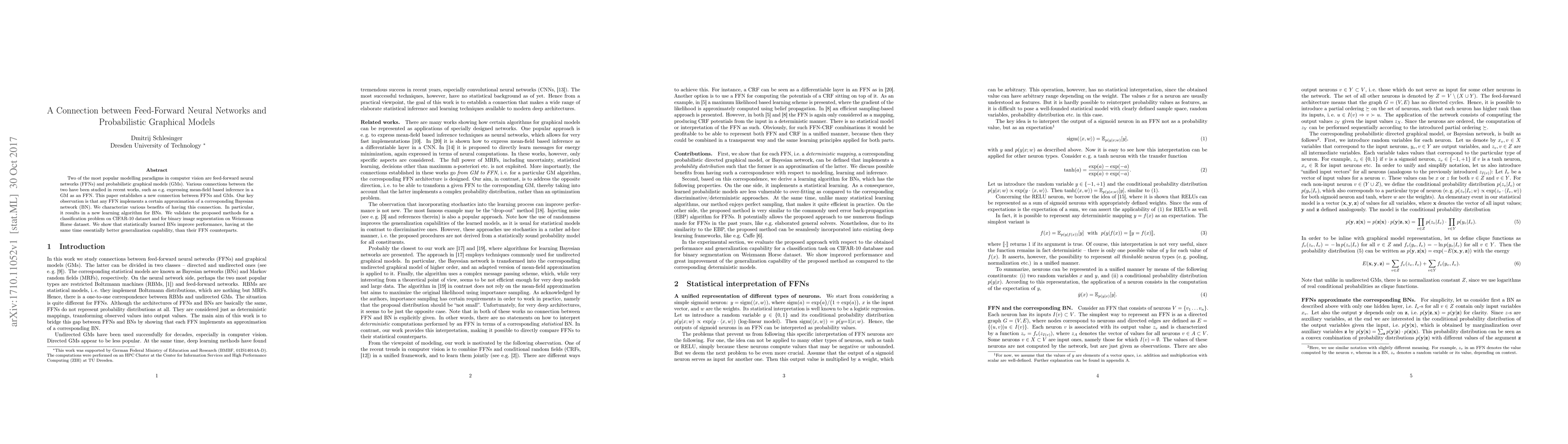 This paper reveals a novel link between feed-forward neural networks (FFNs) and probabilistic graphical models (GMs), showing FFNs approximate a specific Bayesian network (BN). This connection leads to a new learning algorithm for BNs, demonstrated to enhance performance and generalization in classification tasks on CIFAR-10 and binary image segmentation on Weizmann Horse dataset, outperforming FFNs.