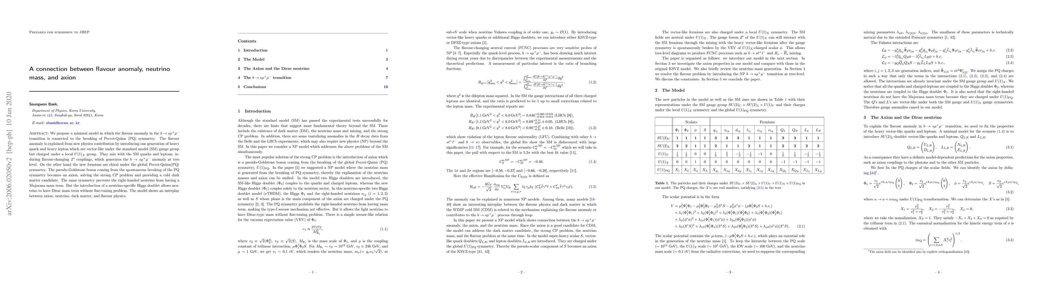 This paper proposes a model linking the $b \to s \mu^+\mu^-$ flavour anomaly to Peccei-Quinn symmetry breaking, where new vector-like fermions induce the anomaly and an axion solves the strong CP problem and provides dark matter. Neutrinos acquire Dirac mass via a neutrino-specific Higgs, avoiding Majorana mass.