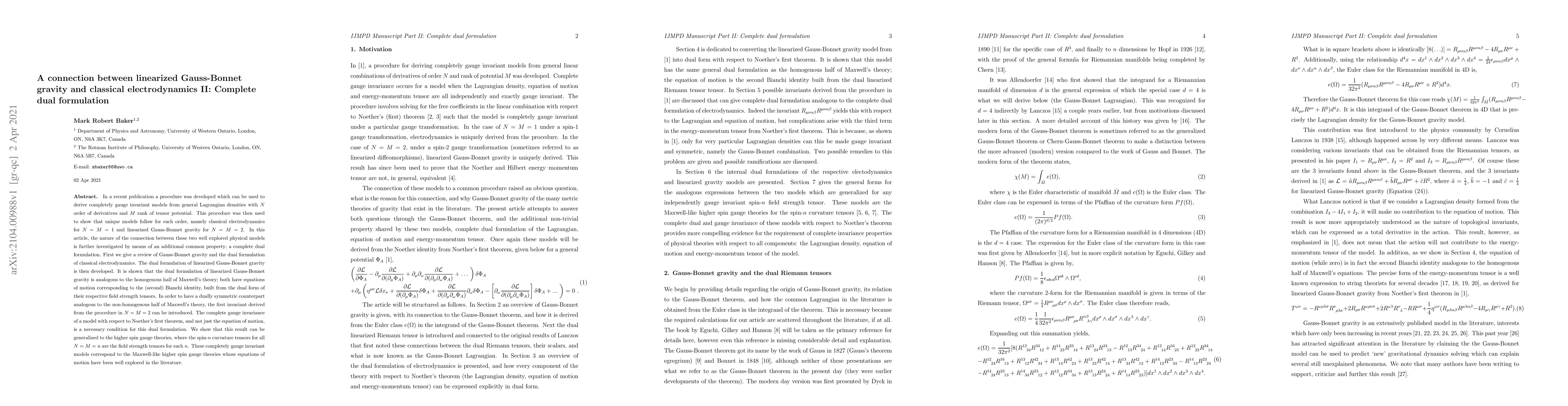 This paper explores the connection between linearized Gauss-Bonnet gravity and classical electrodynamics through a complete dual formulation. It develops a dual formulation for linearized Gauss-Bonnet gravity analogous to the homogenous half of Maxwell's theory, emphasizing the complete gauge invariance necessary for such a formulation.