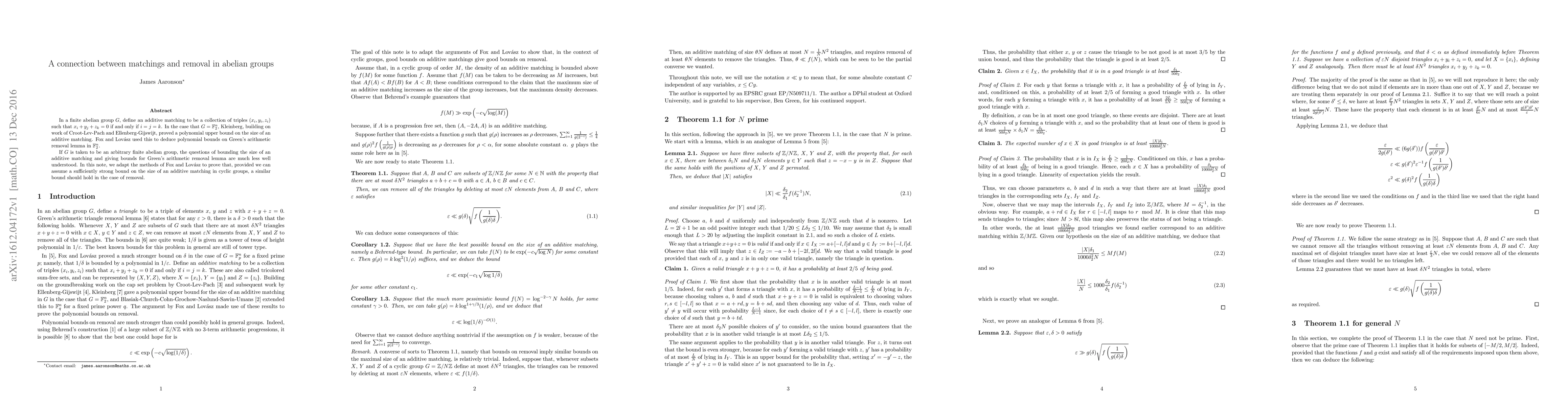 The paper adapts methods from Fox and Lovász to prove bounds on removal in abelian groups, assuming strong bounds on additive matchings in cyclic groups.