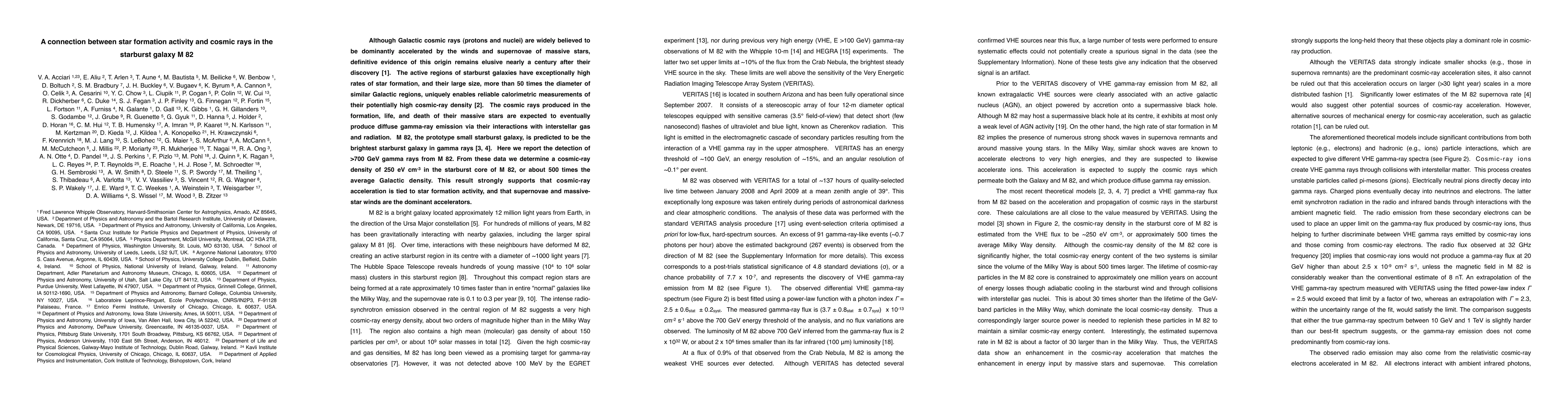 This paper reports the detection of >700 GeV gamma rays from the starburst galaxy M 82, providing evidence for a cosmic-ray density 500 times higher than the average Galactic density, strongly supporting the link between cosmic-ray acceleration and star formation activity in starburst galaxies.