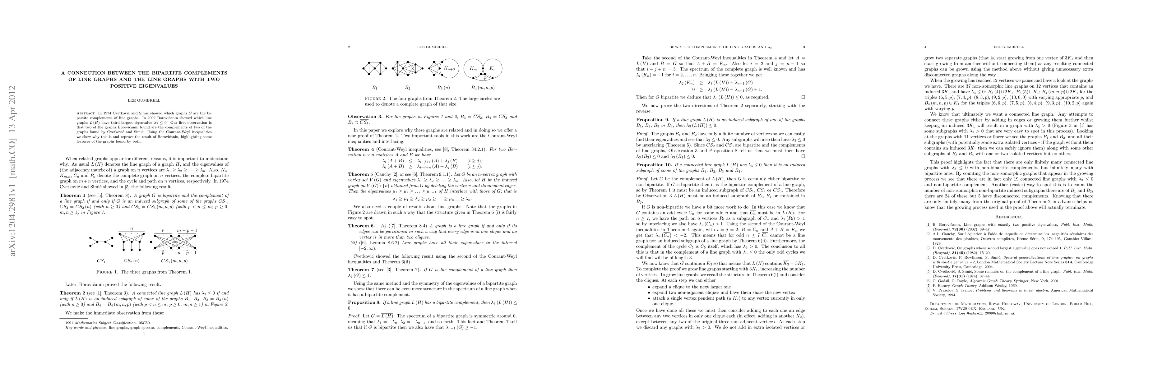 The paper explores a connection between bipartite complements of line graphs and line graphs with two positive eigenvalues, using Courant-Weyl inequalities to prove that some graphs satisfy both conditions.