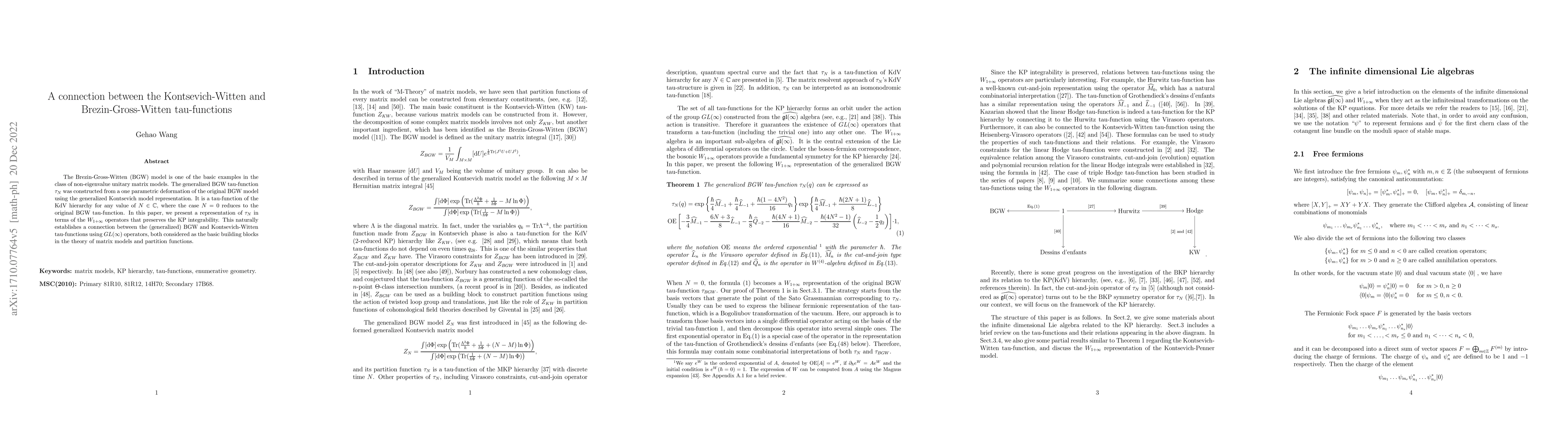 This paper establishes a connection between the generalized Brezin-Gross-Witten (BGW) tau-functions and the Kontsevich-Witten tau-functions via a representation using $W_{1+\infty}$ operators, preserving the KP integrability and highlighting their shared role in matrix models and partition functions.