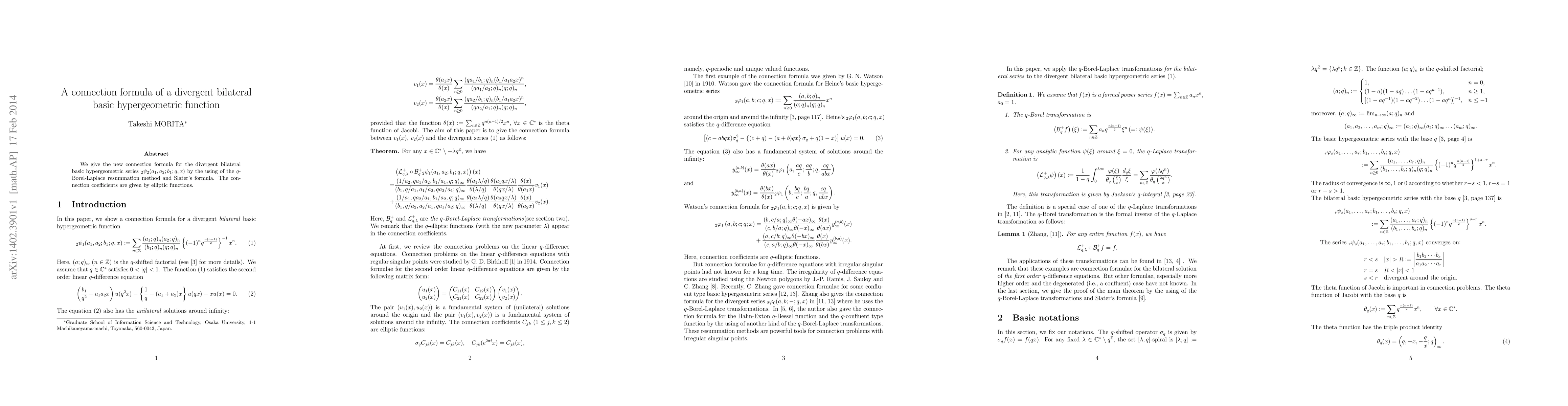 We give the new connection formula for the divergent bilateral basic hypergeometric series ${}_2\psi_2(a_1,a_2;b_1;q,x)$ by the using of the $q$-Borel-Laplace resummation method and Slater's formula. The connection coefficients are given by elliptic functions.
