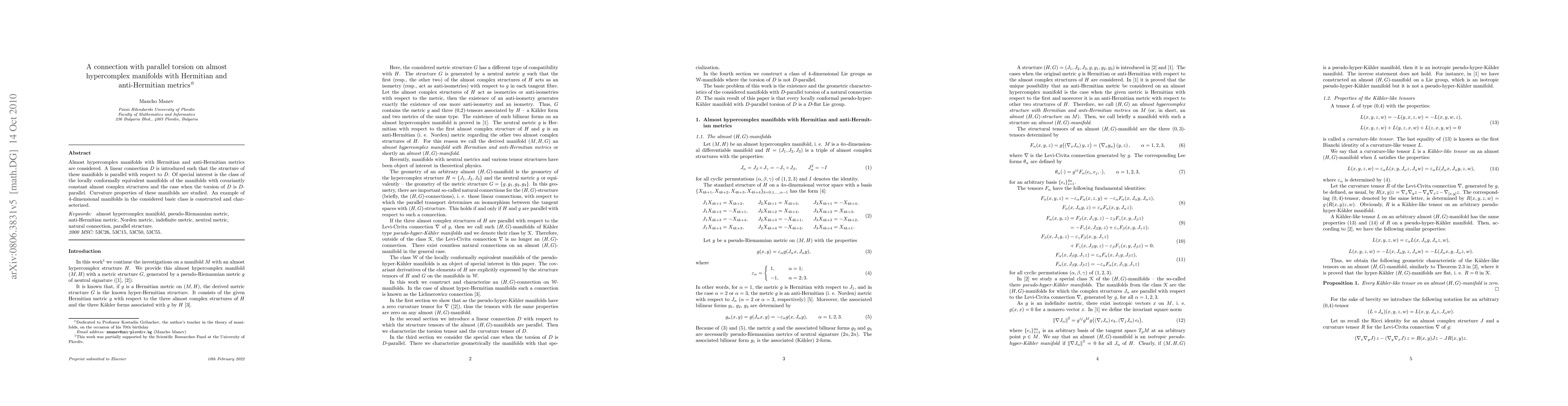 This paper introduces a linear connection $D$ on almost hypercomplex manifolds equipped with Hermitian and anti-Hermitian metrics, showing that these structures are parallel under $D$. It particularly examines locally conformally equivalent manifolds with covariantly constant almost complex structures and D-parallel torsion, and studies their curvature properties, culminating in the construction and characterization of a 4-dimensional example.