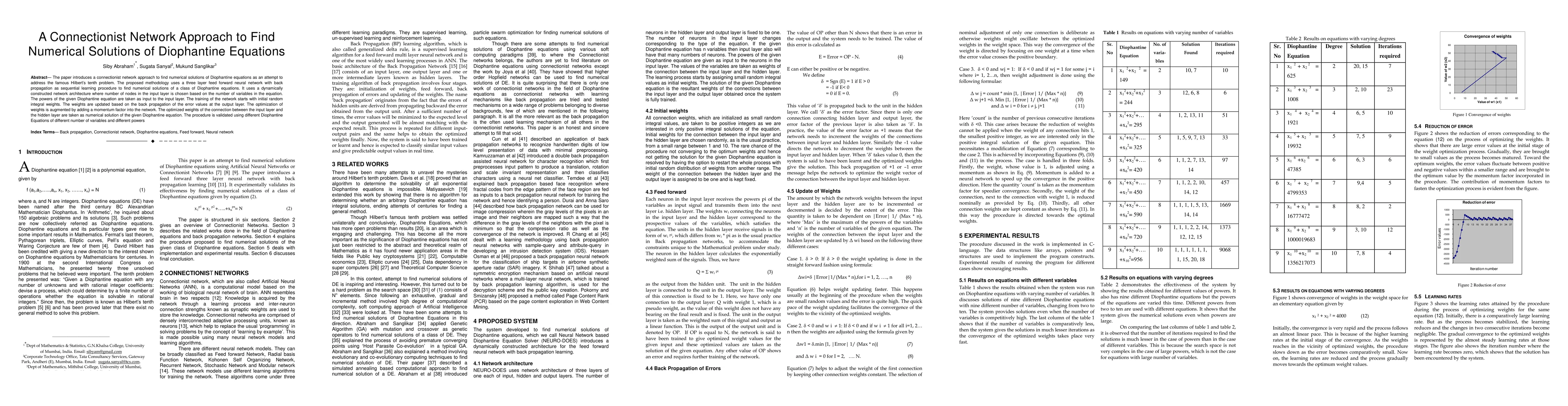 The paper introduces a connectionist network approach to find numerical solutions of Diophantine equations as an attempt to address the famous Hilbert's tenth problem. The proposed methodology uses a three layer feed forward neural network with back propagation as sequential learning procedure to find numerical solutions of a class of Diophantine equations. It uses a dynamically constructed network architecture where number of nodes in the input layer is chosen based on the number of variables in the equation. The powers of the given Diophantine equation are taken as input to the input layer. The training of the network starts with initial random integral weights. The weights are updated based on the back propagation of the error values at the output layer. The optimization of weights is augmented by adding a momentum factor into the network. The optimized weights of the connection between the input layer and the hidden layer are taken as numerical solution of the given Diophantine equation. The procedure is validated using different Diophantine Equations of different number of variables and different powers.