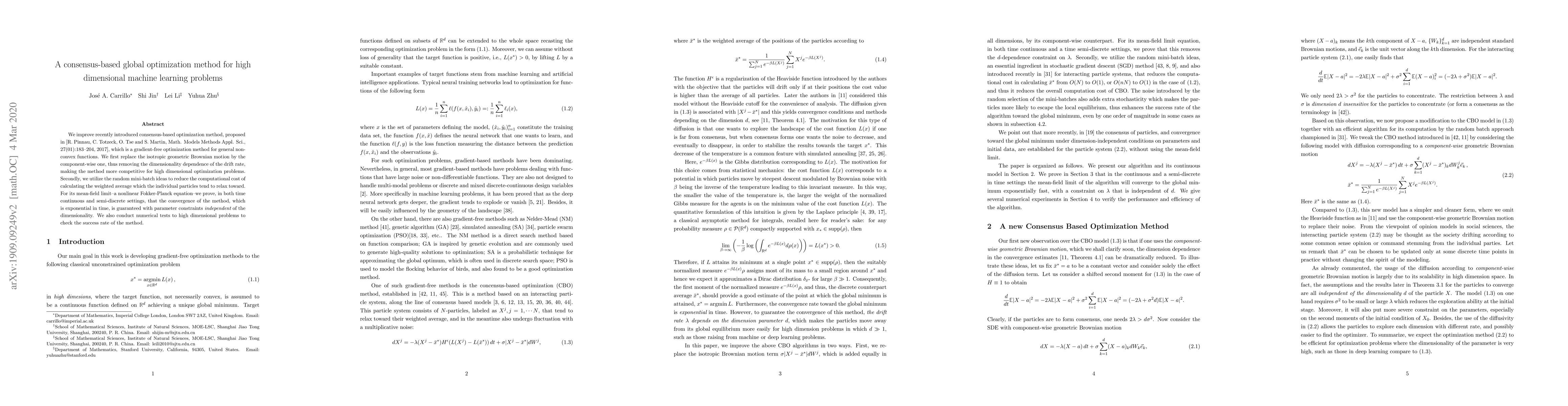Researchers improved a consensus-based optimization method for high-dimensional machine learning problems, removing dimensionality dependence and reducing computational cost, with guaranteed exponential convergence in time.