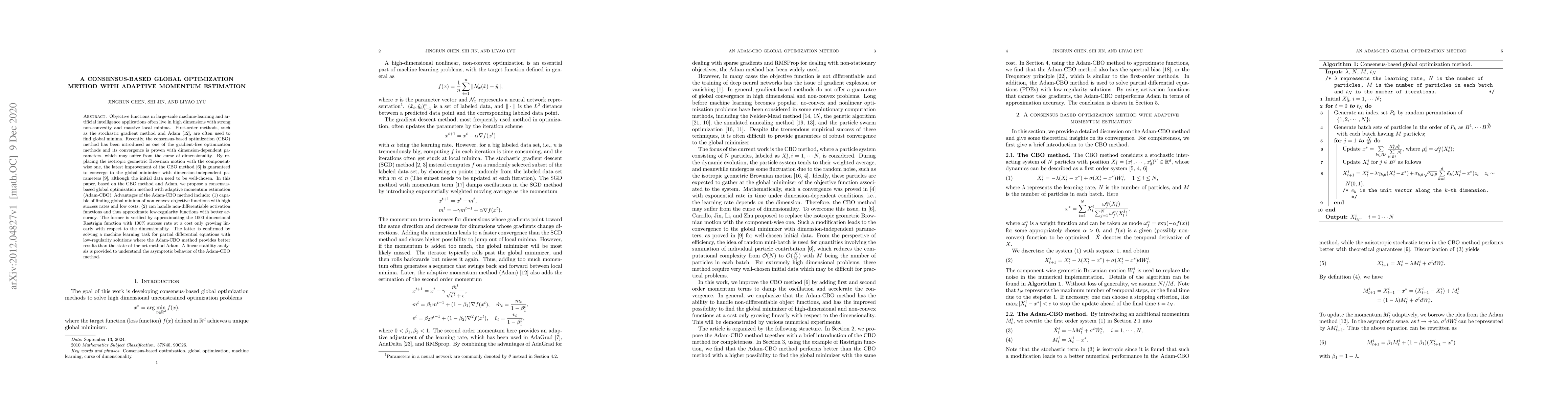 This paper proposes a consensus-based global optimization method with adaptive momentum estimation (Adam-CBO) that combines the CBO method and Adam to efficiently find global minima of high-dimensional, non-convex objective functions. The method demonstrates high success rates and low costs in approximating complex functions, as evidenced by a 1000-dimensional Rastrigin function.
