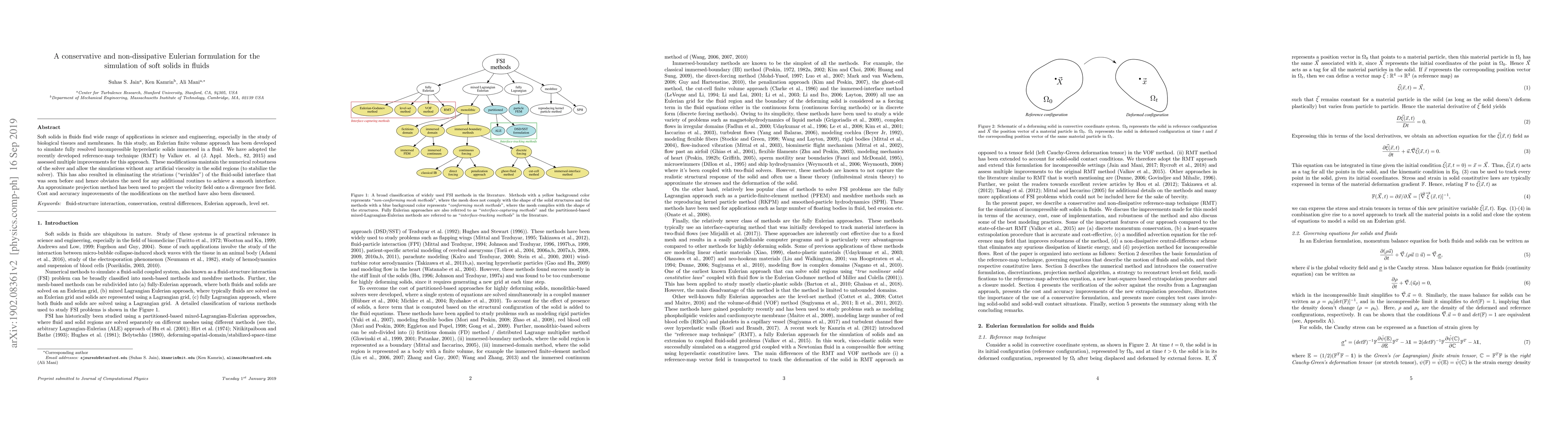 This research presents a novel Eulerian finite volume method for simulating soft solids in fluids without artificial viscosity, utilizing improvements to the reference map technique. It eliminates fluid-solid interface striations and discusses cost and accuracy enhancements.