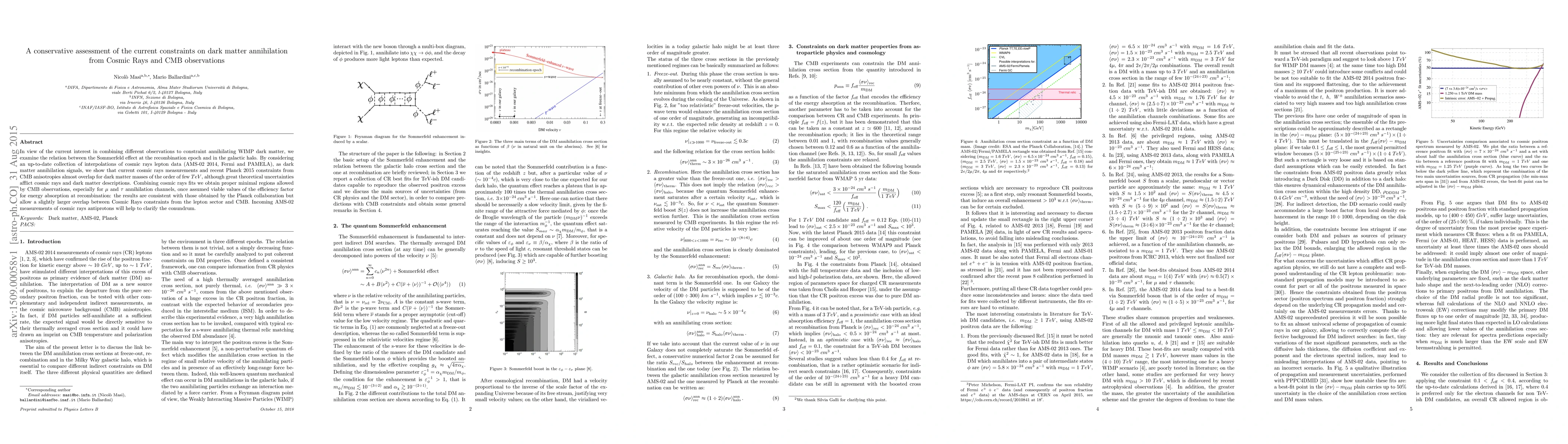 In view of the current interest in combining different observations to constraint annihilating WIMP dark matter, we examine the relation between the Sommerfeld effect at the recombination epoch and in the galactic halo. By considering an up-to-date collection of interpolations of cosmic rays lepton data (AMS-02 2014, Fermi and PAMELA), as dark matter annihilation signals, we show that current cosmic rays measurements and recent Planck 2015 constraints from CMB anisotropies almost overlap for dark matter masses of the order of few $TeV$, although great theoretical uncertainties afflict cosmic rays and dark matter descriptions. Combining cosmic rays fits we obtain proper minimal regions allowed by CMB observations, especially for $\mu$ and $\tau$ annihilation channels, once assumed viable values of the efficiency factor for energy absorption at recombination: the results are consistent with those obtained by the Planck collaboration but allow a slightly larger overlap between Cosmic Rays constraints from the lepton sector and CMB. Incoming AMS-02 measurements of cosmic rays antiprotons will help to clarify the conundrum.