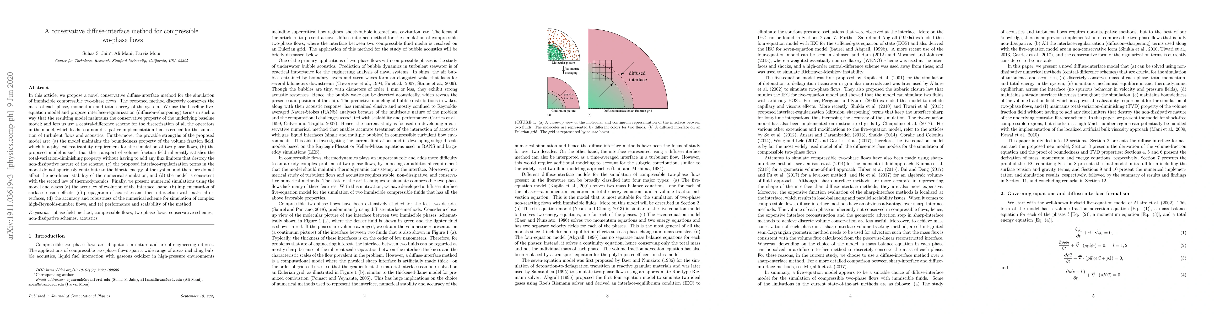 In this article, we propose a novel conservative diffuse-interface method for the simulation of immiscible compressible two-phase flows. The proposed method discretely conserves the mass of each phase, momentum and total energy of the system. We use the baseline five-equation model and propose interface-regularization (diffusion--sharpening) terms in such a way that the resulting model maintains the conservative property of the underlying baseline model; and lets us use a central-difference scheme for the discretization of all the operators in the model, which leads to a non-dissipative implementation that is crucial for the simulation of turbulent flows and acoustics. Furthermore, the provable strengths of the proposed model are: (a) the model maintains the boundedness property of the volume fraction field, which is a physical realizability requirement for the simulation of two-phase flows, (b) the proposed model is such that the transport of volume fraction field inherently satisfies the total-variation-diminishing property without having to add any flux limiters that destroy the non-dissipative nature of the scheme, (c) the proposed interface-regularization terms in the model do not spuriously contribute to the kinetic energy of the system and therefore do not affect the non-linear stability of the numerical simulation, and (d) the model is consistent with the second law of thermodynamics. Finally, we present numerical simulations using the model and assess (a) the accuracy of evolution of the interface shape, (b) implementation of surface tension effects, (c) propagation of acoustics and their interaction with material interfaces, (d) the accuracy and robustness of the numerical scheme for simulation of complex high-Reynolds-number flows, and (e) performance and scalability of the method.