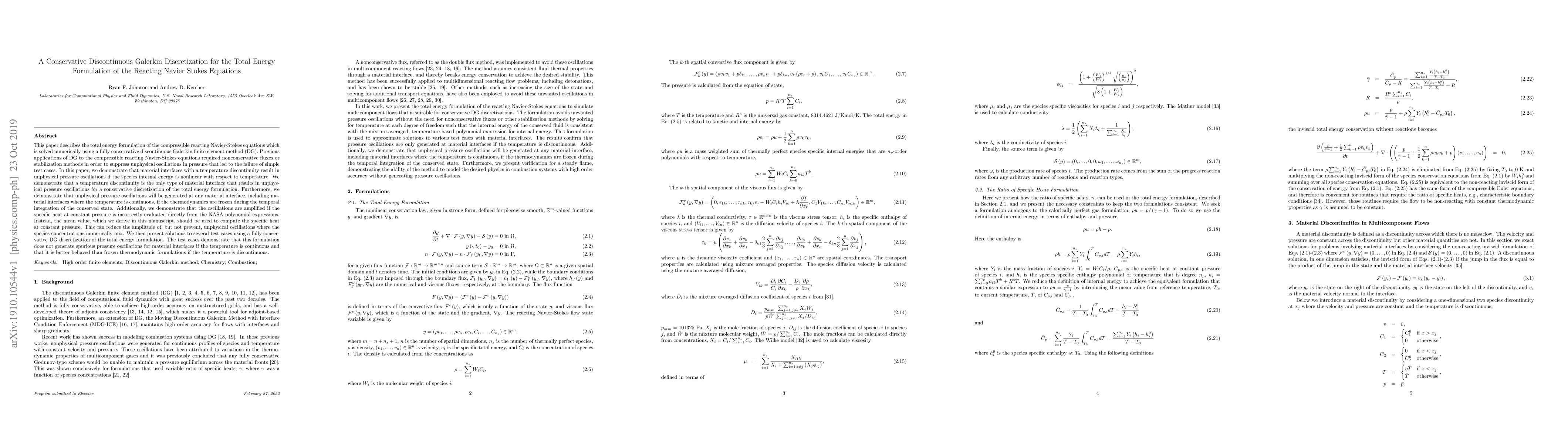 This paper describes the total energy formulation of the compressible reacting Navier-Stokes equations which is solved numerically using a fully conservative discontinuous Galerkin finite element method (DG). Previous applications of DG to the compressible reacting Navier-Stokes equations required nonconservative fluxes or stabilization methods in order to suppress unphysical oscillations in pressure that led to the failure of simple test cases. In this paper, we demonstrate that material interfaces with a temperature discontinuity result in numerical unphysical pressure oscillations if the species internal energy is nonlinear with respect to temperature. We demonstrate that a temperature discontinuity is the only type of material interface that results in unphysical pressure oscillations for a conservative discretization of the total energy formulation. Furthermore, we demonstrate that unphysical pressure oscillations will be generated at any material interface, including material interfaces with at which the temperature is continuous, if the thermodynamics are frozen during the temporal integration of the conserved state. Additionally, we demonstrate that the oscillations are amplified if the specific heat at constant pressure is incorrectly evaluated directly from the NASA polynomial expressions. Instead, the mean value, which we derive in this manuscript, should be used to compute the specific heat at constant pressure. This can reduce the amplitude of, but not prevent, unphysical oscillations where the species concentrations numerically mix. We then present solutions to several test cases using the total energy formulation and demonstrate spurious pressure oscillations were not generated for material interfaces if the temperature is continuous and that it is better behaved than frozen thermodynamic formulations if the temperature is discontinuous.