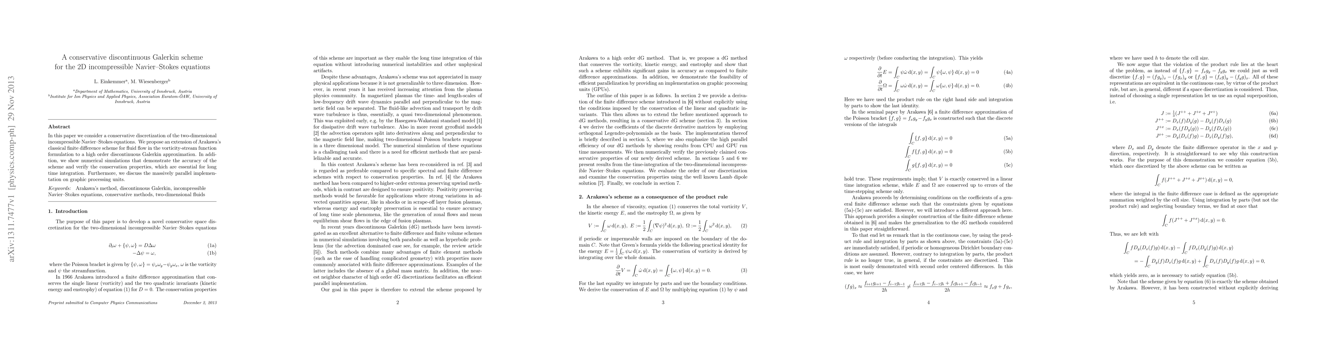 In this paper we consider a conservative discretization of the two-dimensional incompressible Navier--Stokes equations. We propose an extension of Arakawa's classical finite difference scheme for fluid flow in the vorticity-stream function formulation to a high order discontinuous Galerkin approximation. In addition, we show numerical simulations that demonstrate the accuracy of the scheme and verify the conservation properties, which are essential for long time integration. Furthermore, we discuss the massively parallel implementation on graphic processing units.