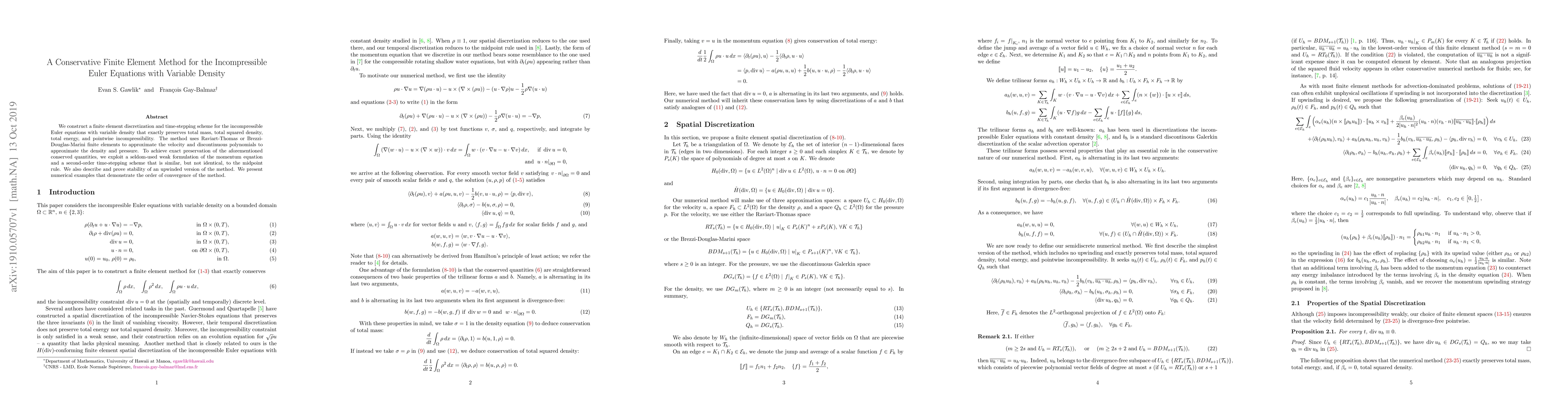 We construct a finite element discretization and time-stepping scheme for the incompressible Euler equations with variable density that exactly preserves total mass, total squared density, total energy, and pointwise incompressibility. The method uses Raviart-Thomas or Brezzi-Douglas-Marini finite elements to approximate the velocity and discontinuous polynomials to approximate the density and pressure. To achieve exact preservation of the aforementioned conserved quantities, we exploit a seldom-used weak formulation of the momentum equation and a second-order time-stepping scheme that is similar, but not identical, to the midpoint rule. We also describe and prove stability of an upwinded version of the method. We present numerical examples that demonstrate the order of convergence of the method.