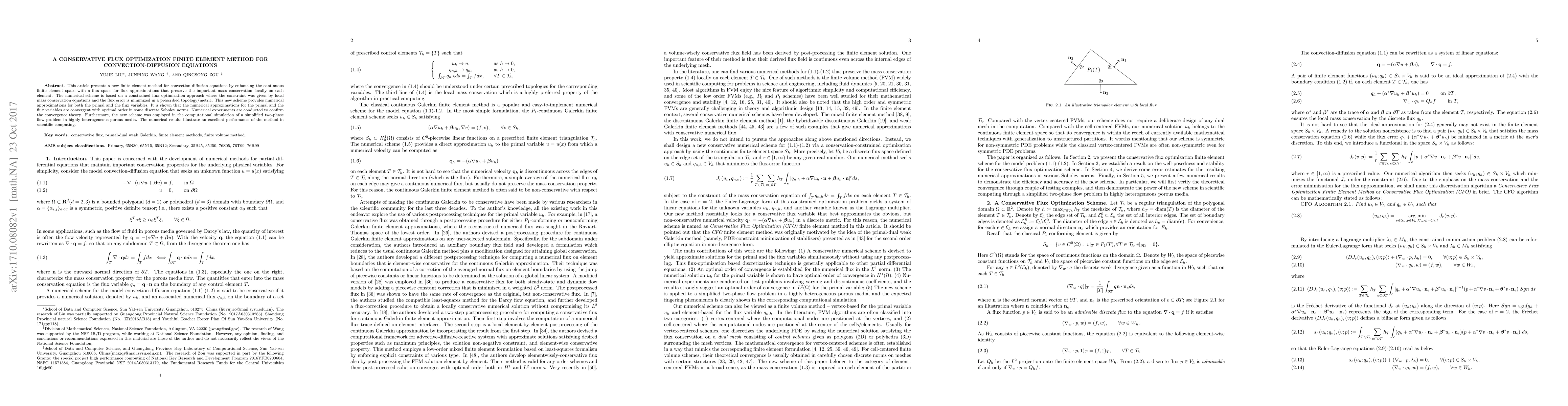 This article presents a new finite element method for convection-diffusion equations by enhancing the continuous finite element space with a flux space for flux approximations that preserve the important mass conservation locally on each element. The numerical scheme is based on a constrained flux optimization approach where the constraint was given by local mass conservation equations and the flux error is minimized in a prescribed topology/metric. This new scheme provides numerical approximations for both the primal and the flux variables. It is shown that the numerical approximations for the primal and the flux variables are convergent with optimal order in some discrete Sobolev norms. Numerical experiments are conducted to confirm the convergence theory. Furthermore, the new scheme was employed in the computational simulation of a simplified two-phase flow problem in highly heterogeneous porous media. The numerical results illustrate an excellent performance of the method in scientific computing.