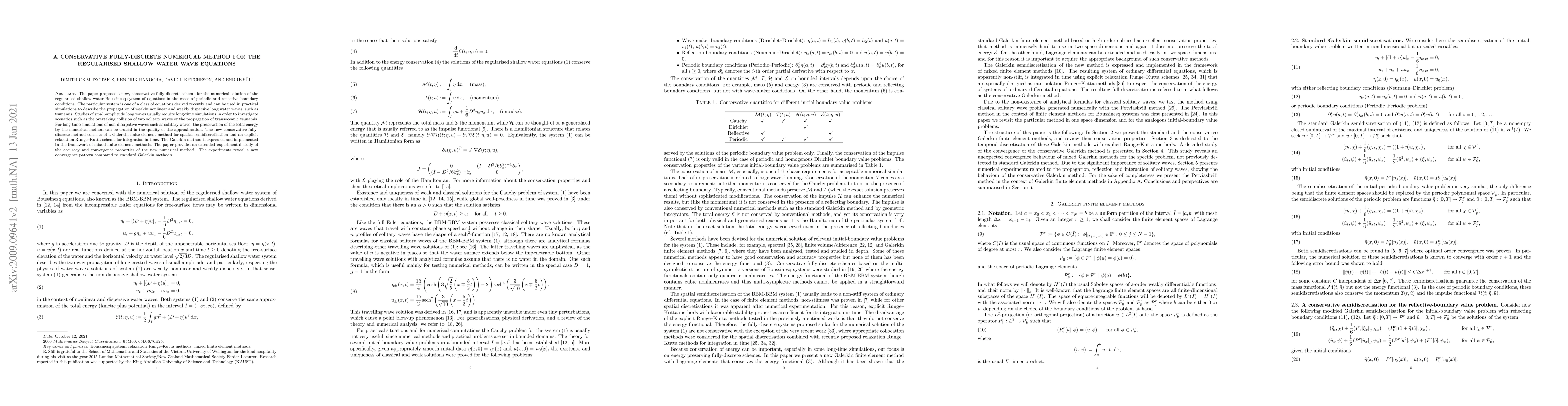 The paper introduces a conservative fully-discrete numerical scheme for solving the regularised shallow water Boussinesq equations, employing a Galerkin finite element method and an explicit relaxation Runge-Kutta scheme, with an emphasis on energy preservation for long-time simulations of weakly nonlinear waves. The study demonstrates a novel convergence pattern and improved accuracy over standard methods.