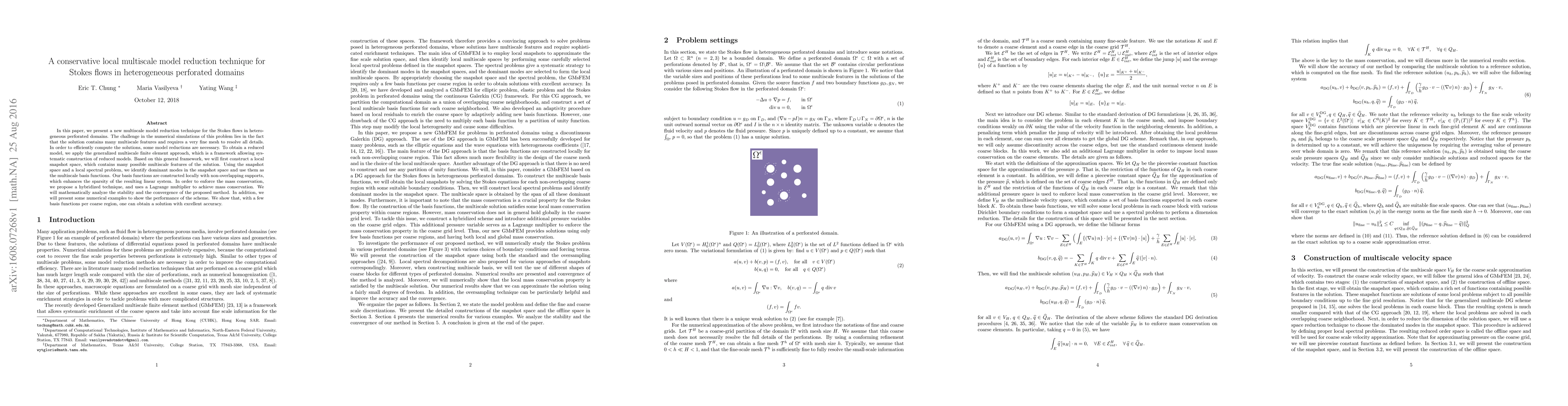 This paper introduces a conservative local multiscale model reduction technique for simulating Stokes flows in heterogeneous perforated domains. The method employs a generalized multiscale finite element approach to construct a reduced model with enhanced sparsity and mass conservation, demonstrating excellent accuracy with minimal basis functions.