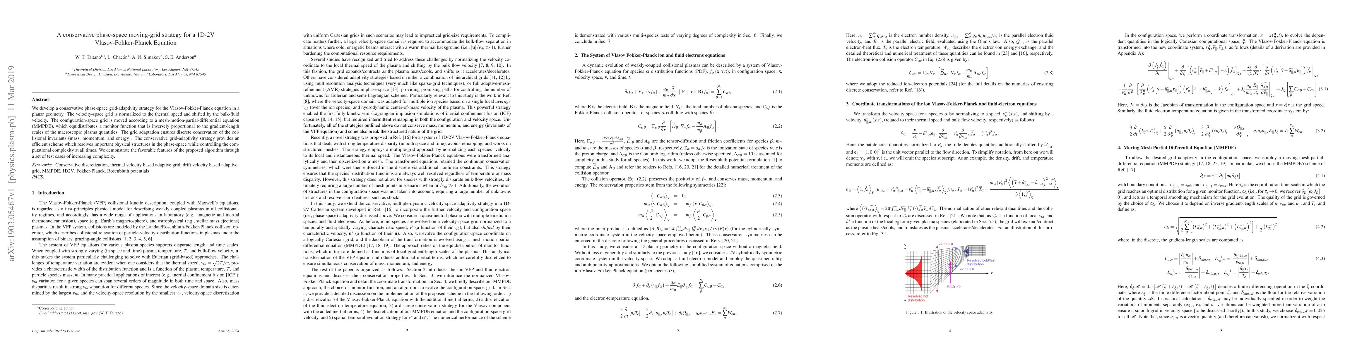 This paper introduces a conservative phase-space moving-grid strategy for solving the Vlasov-Fokker-Planck equation in 1D-2V planar geometry. The method adapts the grid to equidistribute a monitor function based on macroscopic plasma quantities, ensuring conservation of collisional invariants and resolving physical structures efficiently.