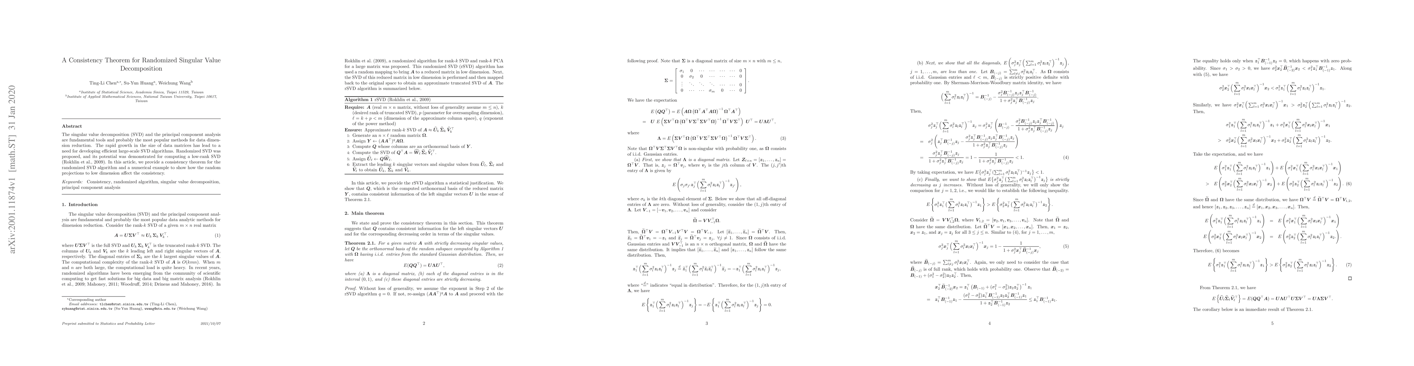 This paper presents a consistency theorem for the randomized SVD algorithm, demonstrating its effectiveness in large-scale data dimension reduction and providing a numerical example to illustrate the impact of random projections on consistency.