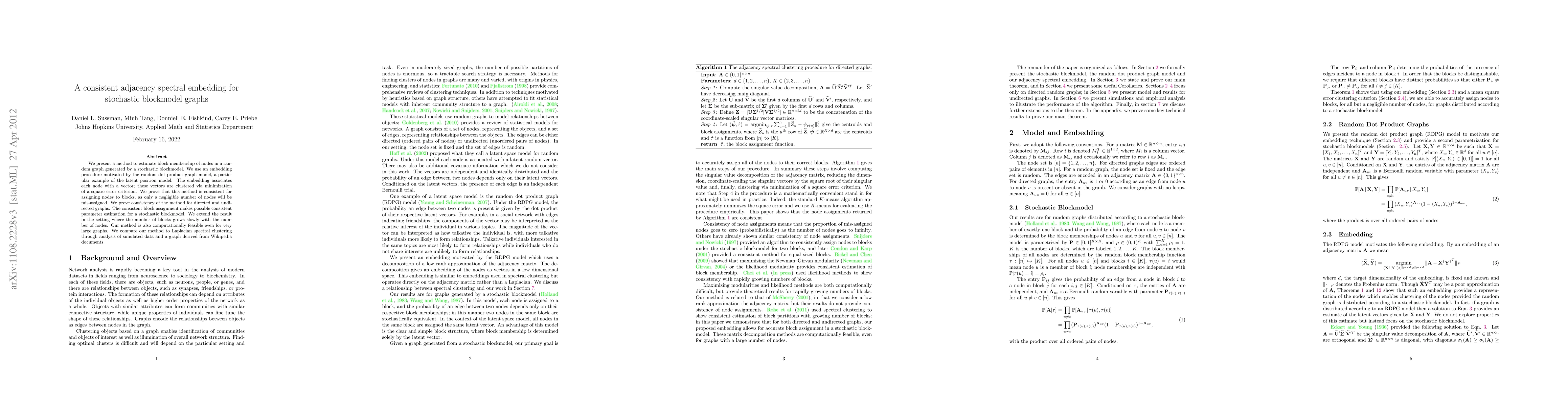 This paper introduces a consistent adjacency spectral embedding method for estimating node block membership in stochastic blockmodel graphs, proving its effectiveness for both directed and undirected graphs. The method is computationally feasible and outperforms Laplacian spectral clustering, as demonstrated through simulations and real-world data analysis.