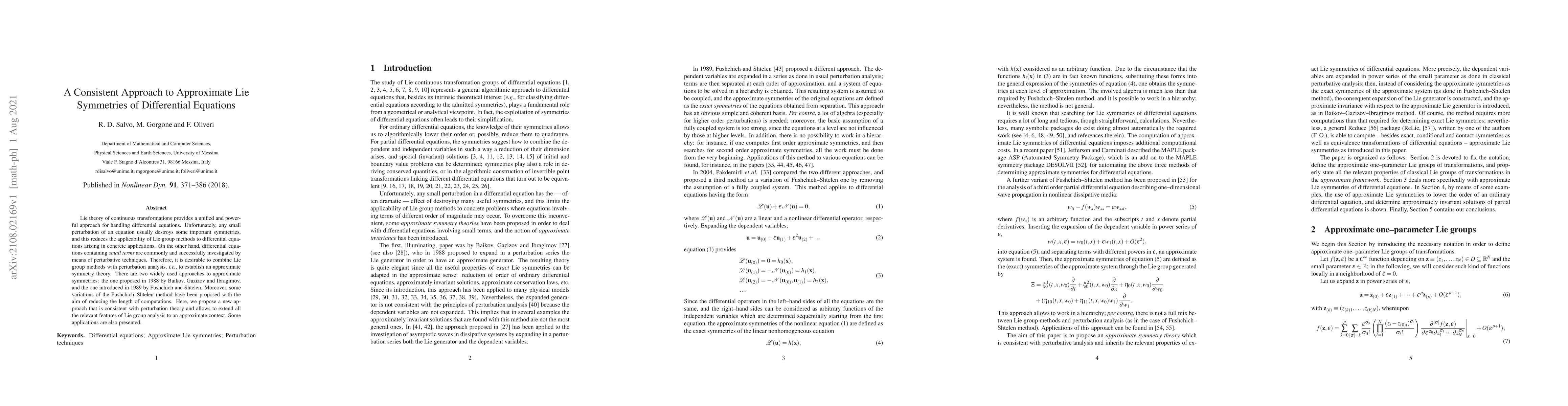 This paper proposes a new consistent approach to approximate Lie symmetries for differential equations, integrating Lie group methods with perturbation analysis. It aims to extend the applicability of Lie group theory to perturbed differential equations by combining it with perturbative techniques, offering a more comprehensive method than existing approximate symmetry theories.