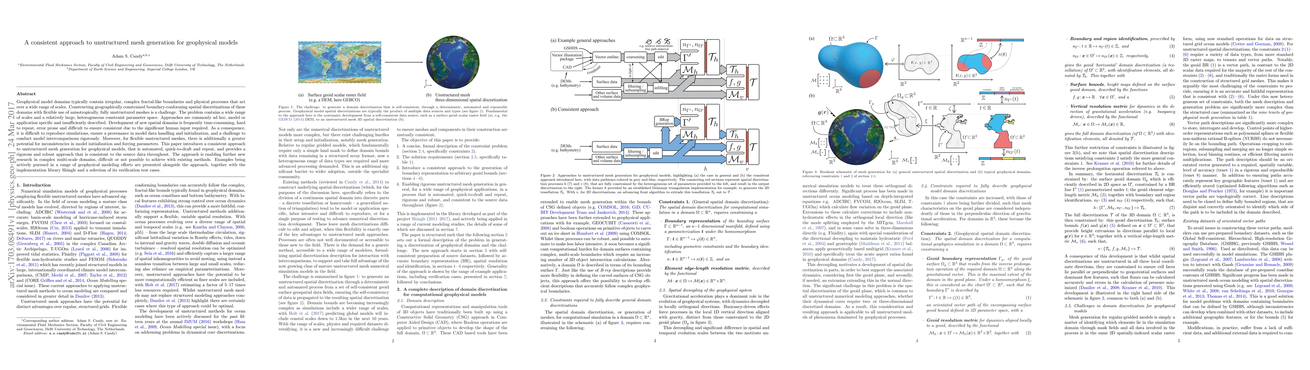 This paper presents a consistent, automated method for generating unstructured meshes for geophysical models, addressing the challenges of irregular boundaries and multi-scale processes. The proposed approach aims to improve reproducibility, provenance, and intercomparison of simulations by providing a robust and flexible mesh generation process.