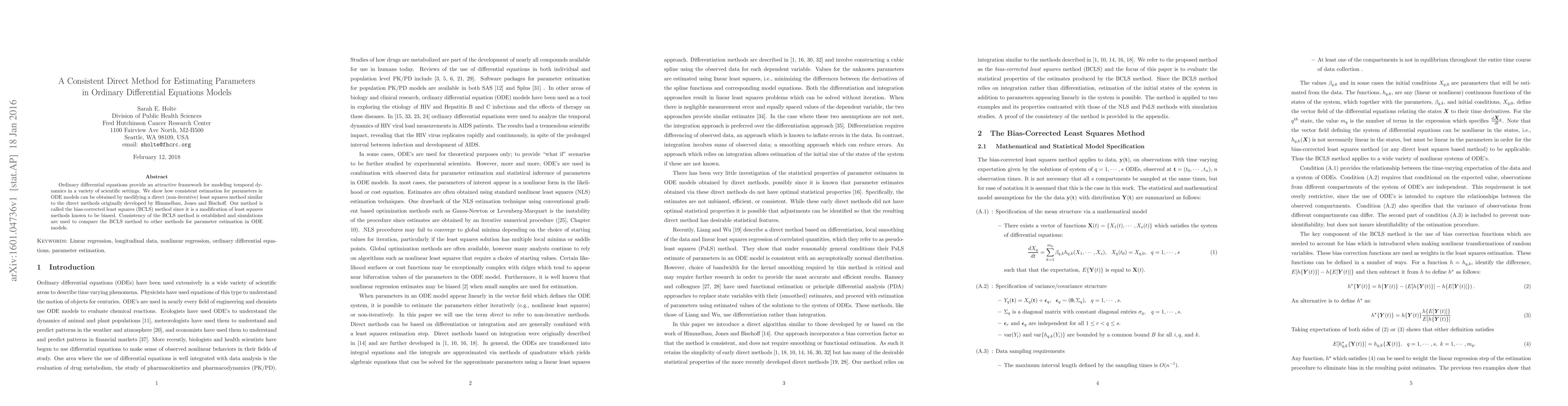 This paper introduces a bias-corrected least squares (BCLS) method for estimating parameters in ordinary differential equation (ODE) models, modifying a direct non-iterative least squares approach to achieve consistent estimation. The method is shown to outperform other estimation techniques through simulation comparisons.