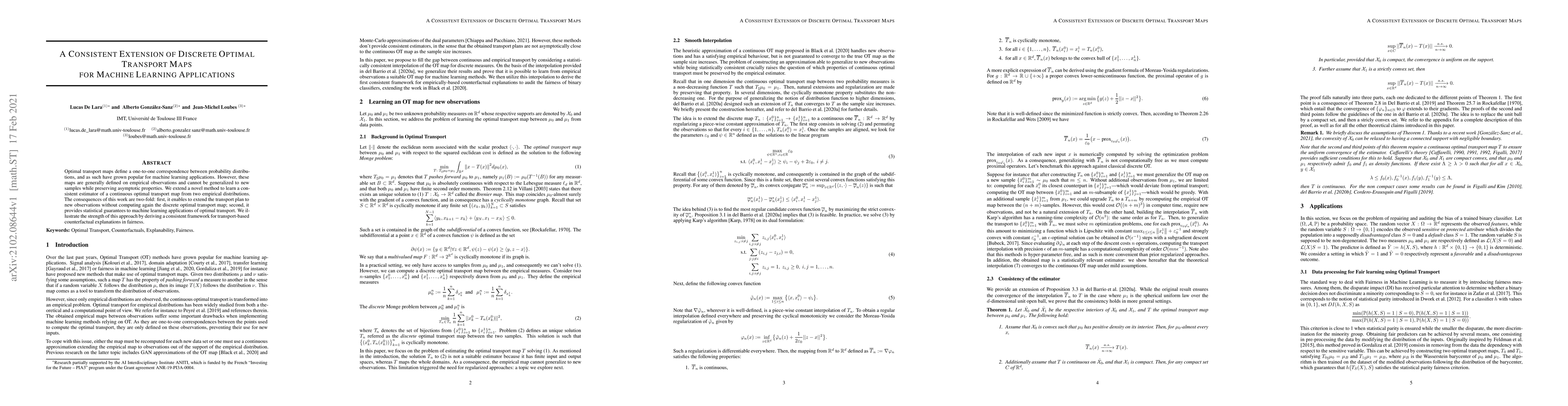 Optimal transport maps define a one-to-one correspondence between probability distributions, and as such have grown popular for machine learning applications. However, these maps are generally defined on empirical observations and cannot be generalized to new samples while preserving asymptotic properties. We extend a novel method to learn a consistent estimator of a continuous optimal transport map from two empirical distributions. The consequences of this work are two-fold: first, it enables to extend the transport plan to new observations without computing again the discrete optimal transport map; second, it provides statistical guarantees to machine learning applications of optimal transport. We illustrate the strength of this approach by deriving a consistent framework for transport-based counterfactual explanations in fairness.