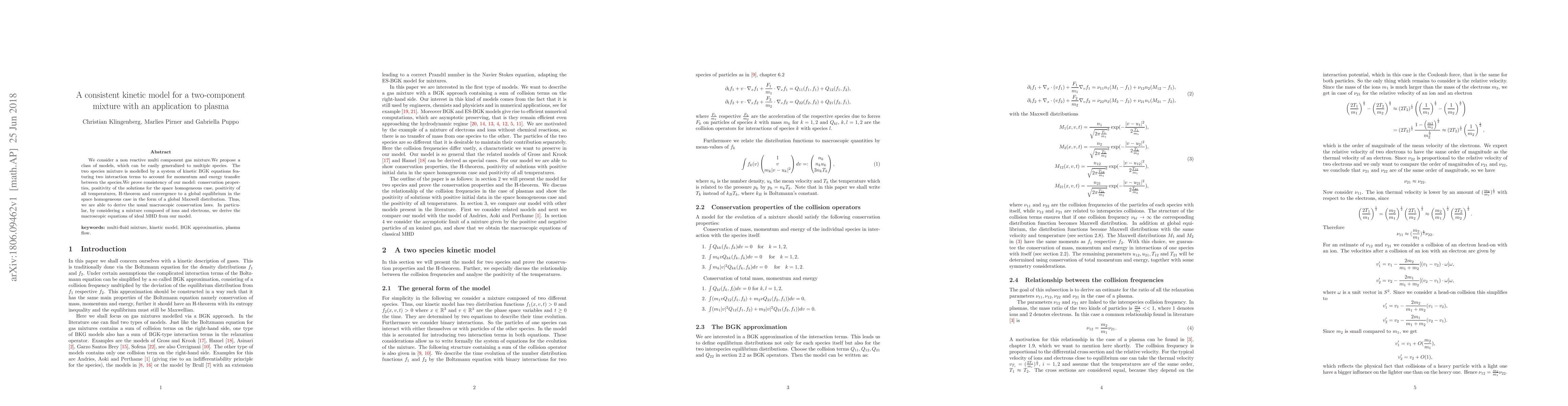 This paper proposes a kinetic model for a two-component gas mixture using BGK equations, demonstrating its consistency through conservation properties, positivity, and convergence to a Maxwell distribution. The model is applied to plasma, deriving ideal MHD equations from the macroscopic conservation laws.