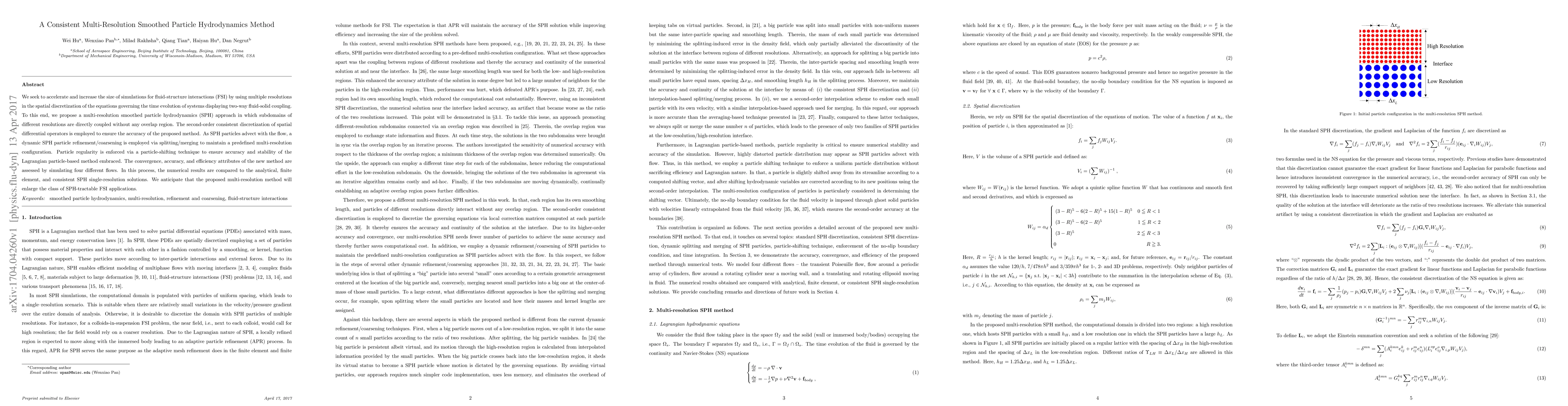This paper proposes a multi-resolution smoothed particle hydrodynamics (SPH) method to enhance fluid-structure interaction simulations by employing different resolutions in spatial discretization. The method uses dynamic particle refinement/coarsening and particle shifting to maintain accuracy and stability, and is validated through comparison with analytical and finite element solutions.