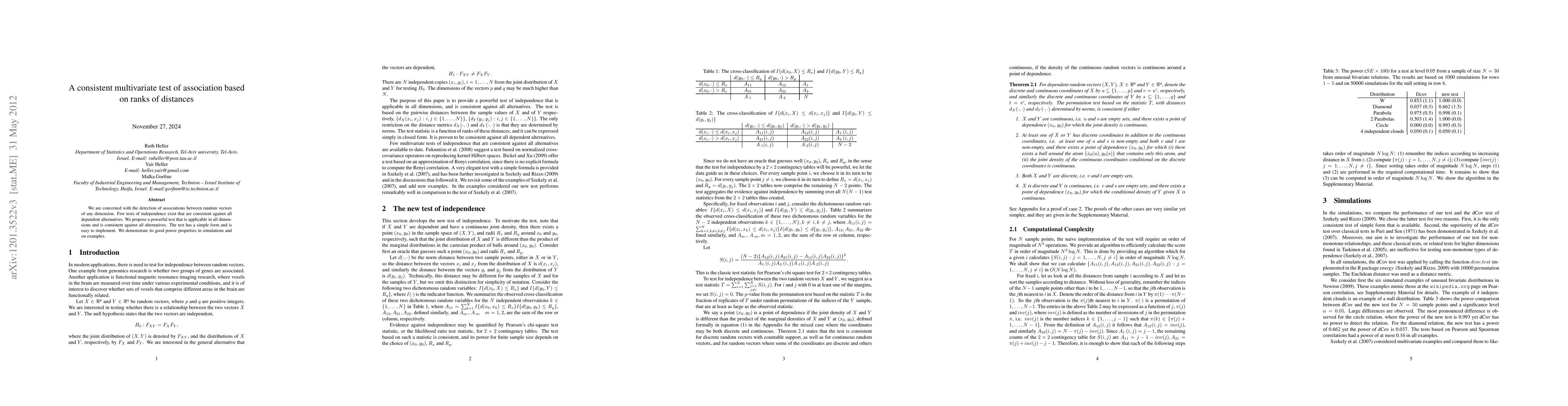 We are concerned with the detection of associations between random vectors of any dimension. Few tests of independence exist that are consistent against all dependent alternatives. We propose a powerful test that is applicable in all dimensions and is consistent against all alternatives. The test has a simple form and is easy to implement. We demonstrate its good power properties in simulations and on examples.