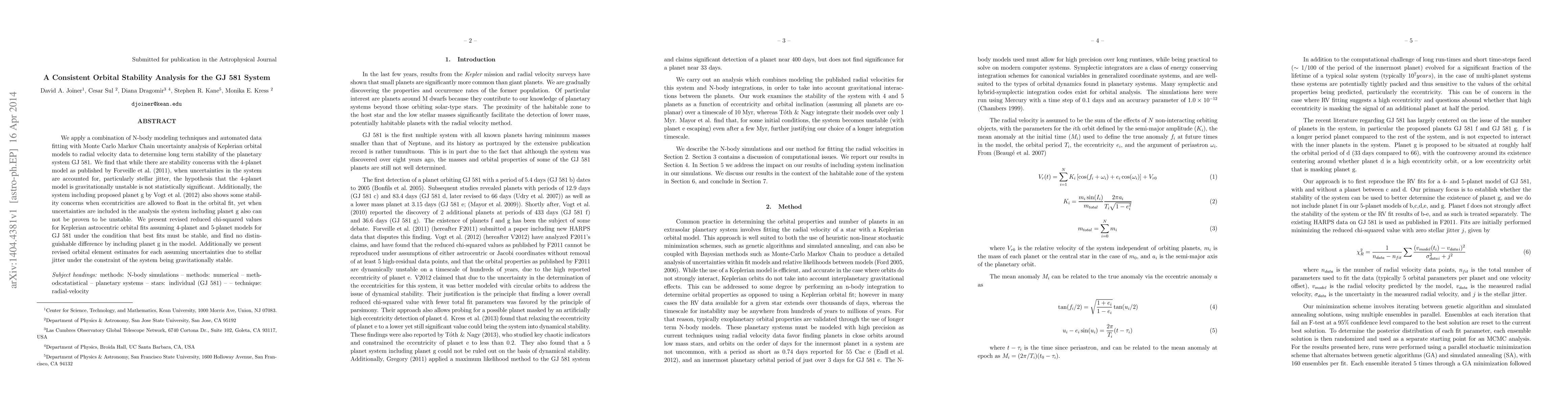 We apply a combination of N-body modeling techniques and automated data fitting with Monte Carlo Markov Chain uncertainty analysis of Keplerian orbital models to radial velocity data to determine long term stability of the planetary system GJ 581. We find that while there are stability concerns with the 4-planet model as published by Forveille et al. (2011), when uncertainties in the system are accounted for, particularly stellar jitter, the hypothesis that the 4-planet model is gravitationally unstable is not statistically significant. Additionally, the system including proposed planet g by Vogt et al. (2012) also shows some stability concerns when eccentricities are allowed to float in the orbital fit, yet when uncertainties are included in the analysis the system including planet g also can not be proven to be unstable. We present revised reduced chi-squared values for Keplerian astrocentric orbital fits assuming 4-planet and 5-planet models for GJ~581 under the condition that best fits must be stable, and find no distinguishable difference by including planet g in the model. Additionally we present revised orbital element estimates for each assuming uncertainties due to stellar jitter under the constraint of the system being gravitationally stable.