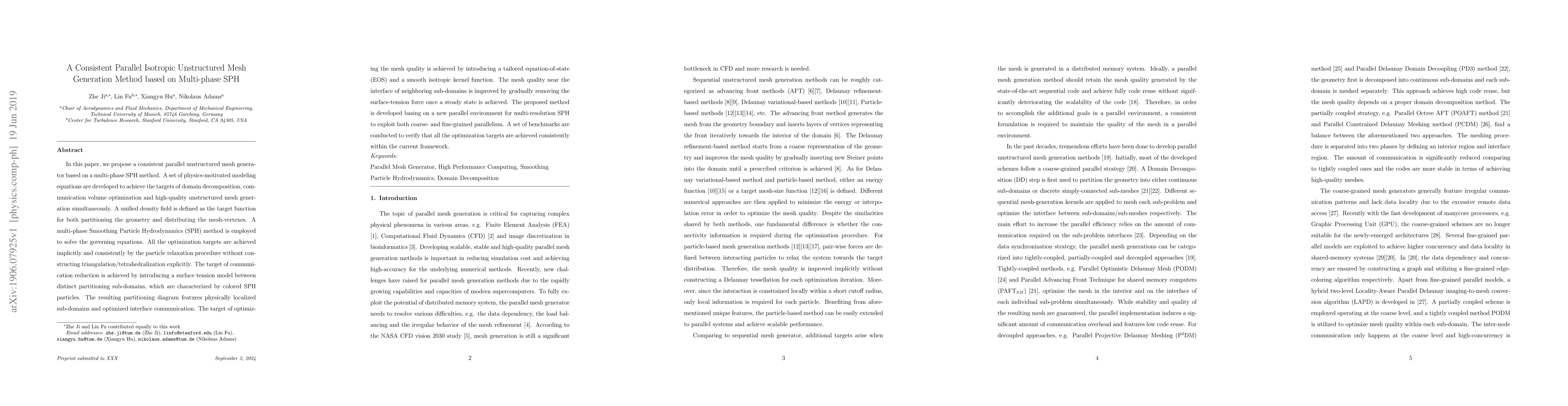 This paper introduces a parallel unstructured mesh generator based on multi-phase SPH, achieving domain decomposition, communication volume optimization, and high-quality mesh generation through physics-motivated modeling and particle relaxation, without explicit triangulation. The method optimizes mesh quality and reduces communication via a tailored equation-of-state and surface tension model.