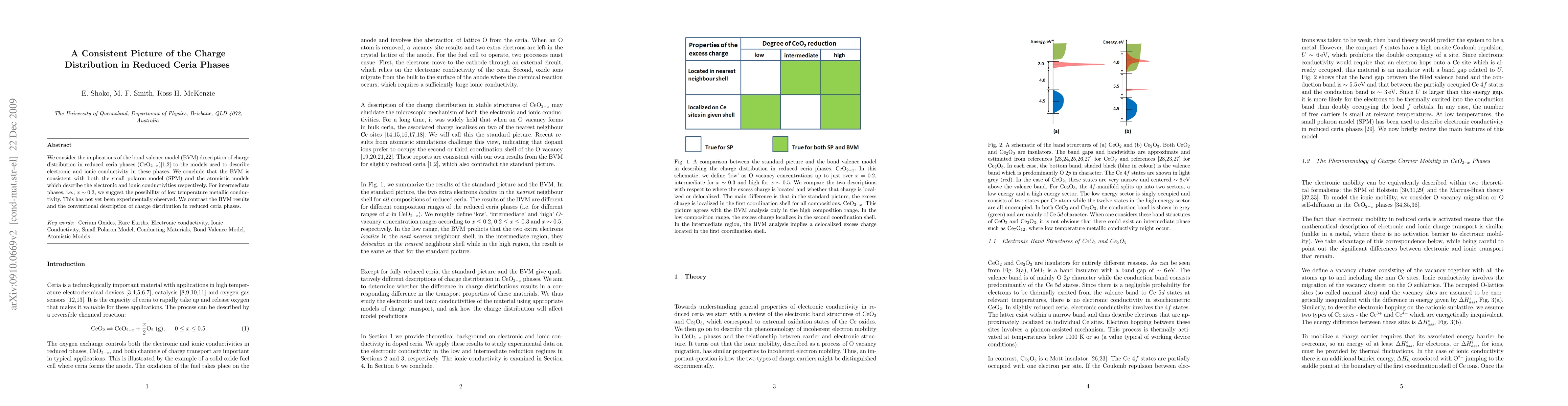 We consider the implications of the bond valence model (BVM) description of charge distribution in reduced ceria phases (CeO$_{2-x}$)\cite{Shoko2009,Shoko2009b} to the models used to describe electronic and ionic conductivity in these phases. We conclude that the BVM is consistent with both the small polaron model (SPM) and the atomistic models which describe the electronic and ionic conductivities respectively. For intermediate phases, i.e., $x \sim 0.3$, we suggest the possibility of low temperature metallic conductivity. This has not yet been experimentally observed. We contrast the BVM results and the conventional description of charge distribution in reduced ceria phases.