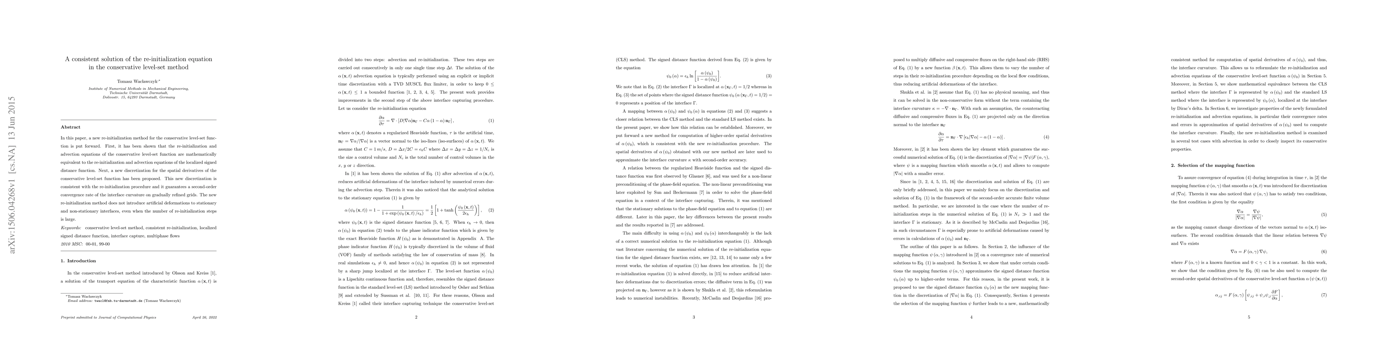 In this paper, a new re-initialization method for the conservative level-set function is put forward. First, it has been shown that the re-initialization and advection equations of the conservative level-set function are mathematically equivalent to the re-initialization and advection equations of the localized signed distance function. Next, a new discretization for the spatial derivatives of the conservative level-set function has been proposed. This new discretization is consistent with the re-initialization procedure and it guarantees a second-order convergence rate of the interface curvature on gradually refined grids. The new re-initialization method does not introduce artificial deformations to stationary and non-stationary interfaces, even when the number of re-initialization steps is large.