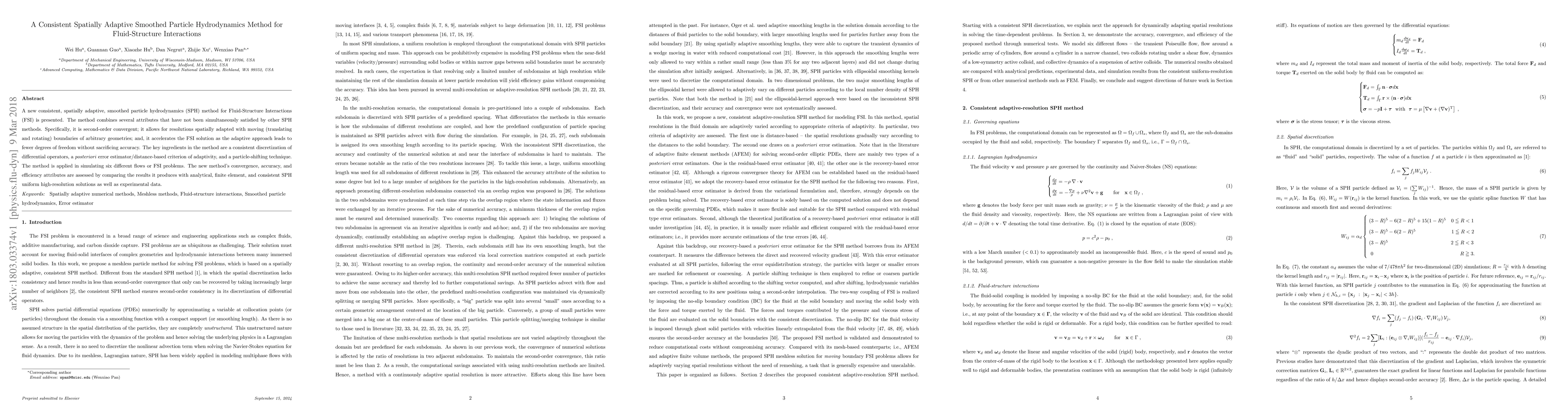 This paper introduces a novel spatially adaptive smoothed particle hydrodynamics (SPH) method for fluid-structure interactions (FSI) that achieves second-order convergence, adapts to moving boundaries of arbitrary geometries, and enhances computational efficiency. The method employs a consistent discretization, an adaptive error estimator, and particle shifting, and is validated through simulations of various FSI problems.