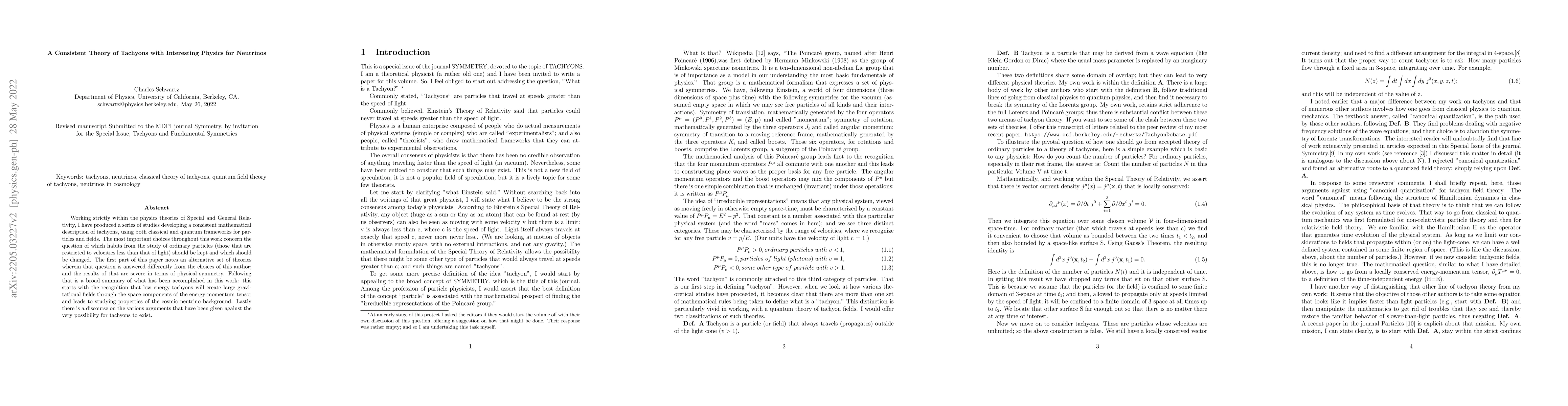 Working strictly within the physics theories of Special and General Relativity, I have produced a series of studies developing a consistent mathematical description of tachyons, using both classical and quantum frameworks for particles and fields. The most important choices throughout this work concern the question of which habits from the study of ordinary particles (those that are restricted to velocities less than that of light) should be kept and which should be changed. The first part of this paper notes an alternative set of theories wherein that question is answered differently from the choices of this author; and the results of that are severe in terms of physical symmetry. Following that is a broad summary of what has been accomplished in this work: this starts with the recognition that low energy tachyons will create large gravitational fields through the space-components of the energy-momentum tensor and leads to studying properties of the cosmic neutrino background. Lastly there is a discourse on the various arguments that have been given against the very possibility for tachyons to exist.