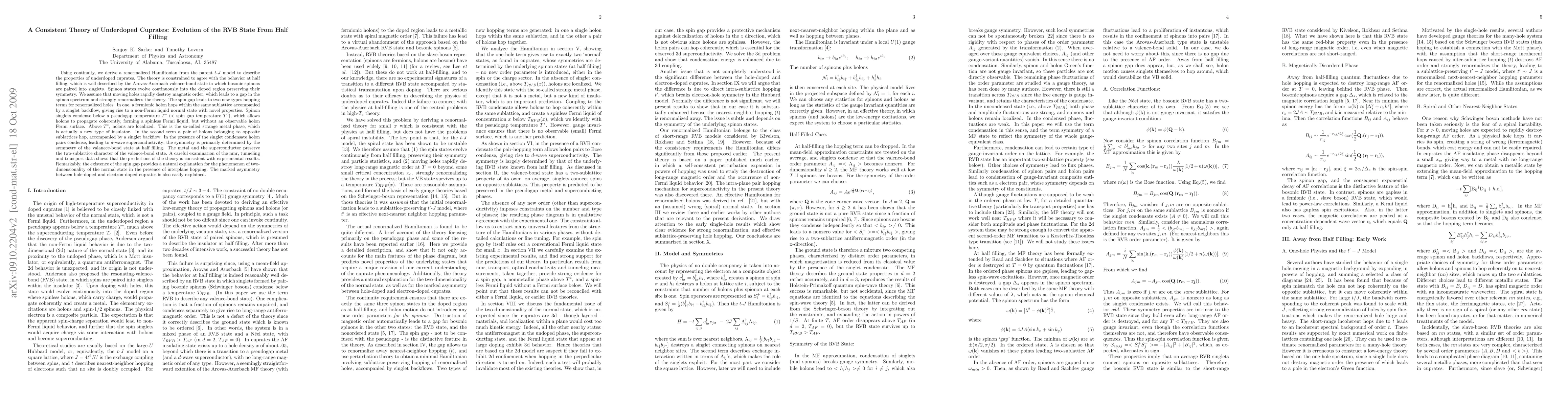 We have been able to resolve two long-standing issues that are central to the theory of high Tc superconductivity: (1) How is the physics of the doped region connected to that of the Mott insulator? (2) What is the origin of the two-dimensionality of the normal state? Specifically, based on the t-J model, we derive a renormalized Hamiltonian to describe the properties of underdoped cuprates. The theory is constrained to agree with the behavior at half filling, which is well described by the bosonic RVB state of Arovas and Auerbach. Moving holes are assumed to destroy long-range magnetic order, which leads to a gap in the spinon spectrum. The presence of the spin gap allows us to derive a constrained Hamiltonian which describes sublattice-preserving hopping by renormalized holons and holon pairs, accompanied by spinon singlet backflows. Below the singlet condensation, i.e, the psudogap (as distinct from the spin gap), temperature T*, holons form a spinless Fermi liquid without an observable small Fermi surface. Above T* holons are localized, giving rise to a (gauge) insulator, which we identify with the strange metal phase. Holon pair hopping leads to a robust d-wave superconductor, its symmetry determined primarily by the symmetry of the RVB state at half filling. The predictions of the theory are shown to be consistent with the results of nmr, tunneling and transport experiments. Remarkably, the existence of the spin gap provides a natural explanation for the two-dimensionality of the normal state. The marked asymmetry between hole-doped and electron-doped cuprates is also easily explained.