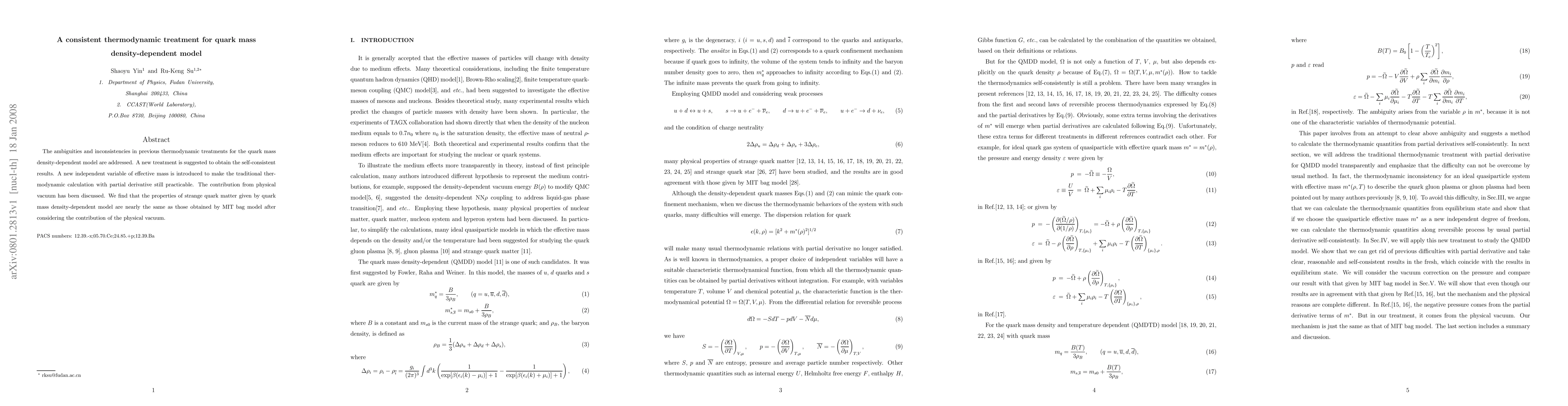 This paper proposes a consistent thermodynamic treatment for the quark mass density-dependent model, addressing previous ambiguities by introducing an effective mass variable. It finds that the model's properties for strange quark matter align closely with those from the MIT bag model when considering the physical vacuum's contribution.