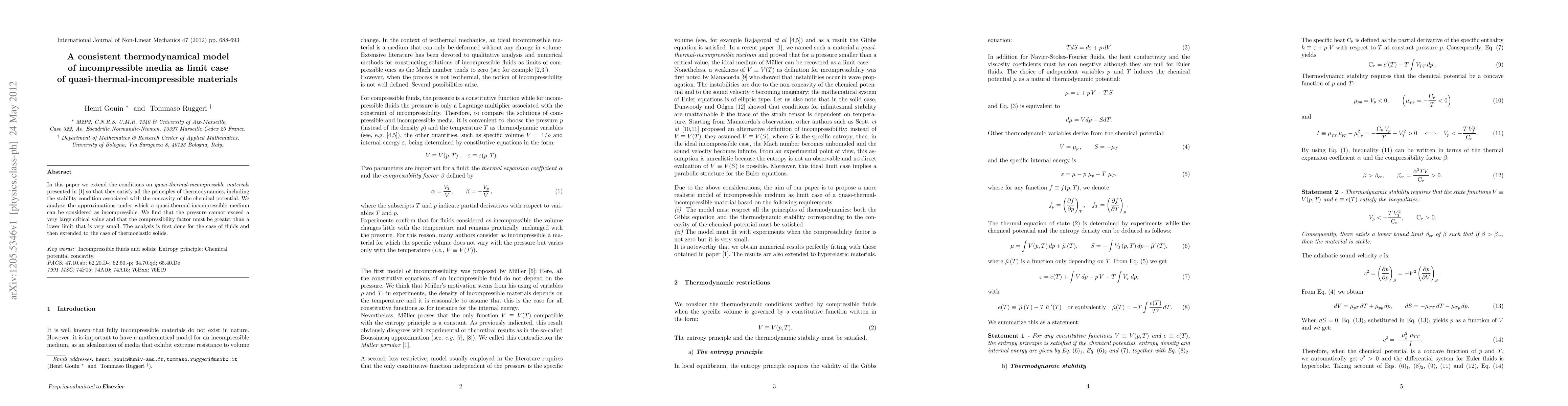 In this paper we consider the conditions on quasi-thermal-incompressible so that they satisfy all the principles of thermodynamics, including the stability condition associated with the concavity of the chemical potential. We analyze the approximations under which a quasi-thermal-incompressible medium can be considered as incompressible. We find that the pressure cannot exceed a very large critical value and that the compressibility factor must be greater than a lower limit that is very small. The analysis is first done for the case of fluids and then extended to the case of thermoelastic solids.